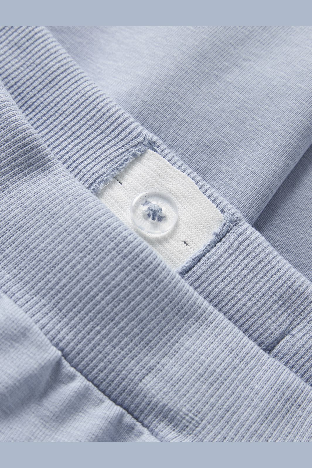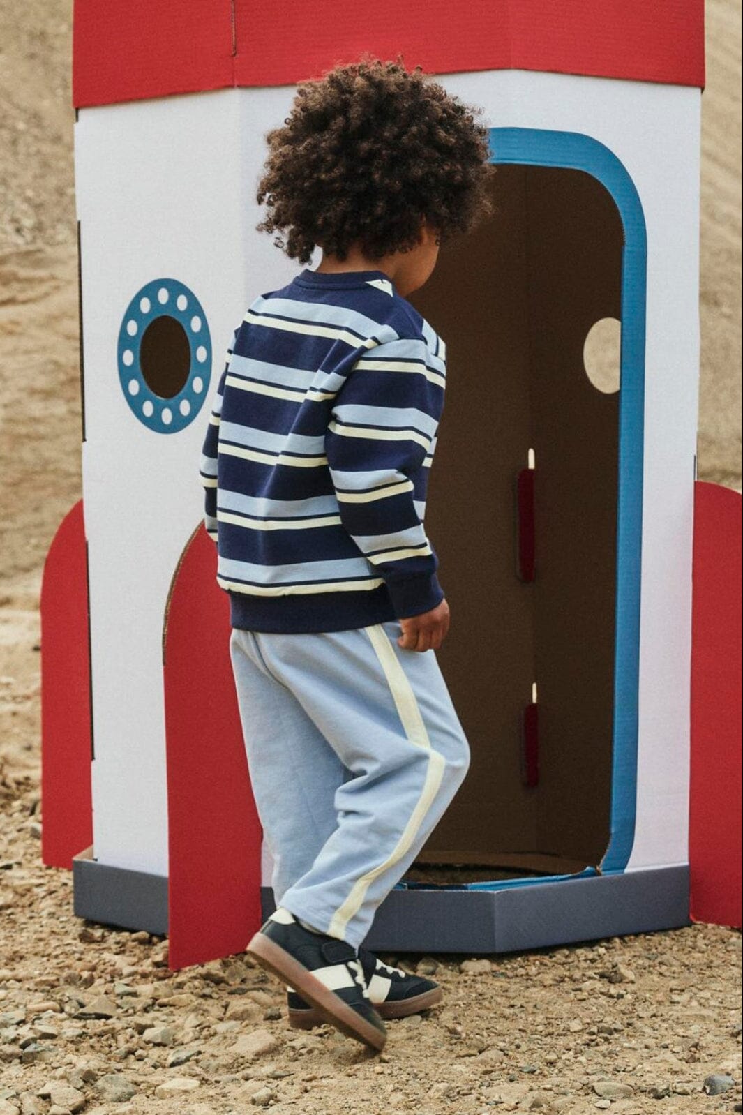 Vaaleansiniset collegehousut Name It -merkiltä, valmistettu luomun ja kierrätetyn puuvillan sekoituksesta. Housuissa on kontrastiväriset raidat sivuilla ja teksti BEING KIND IS COOL edessä.