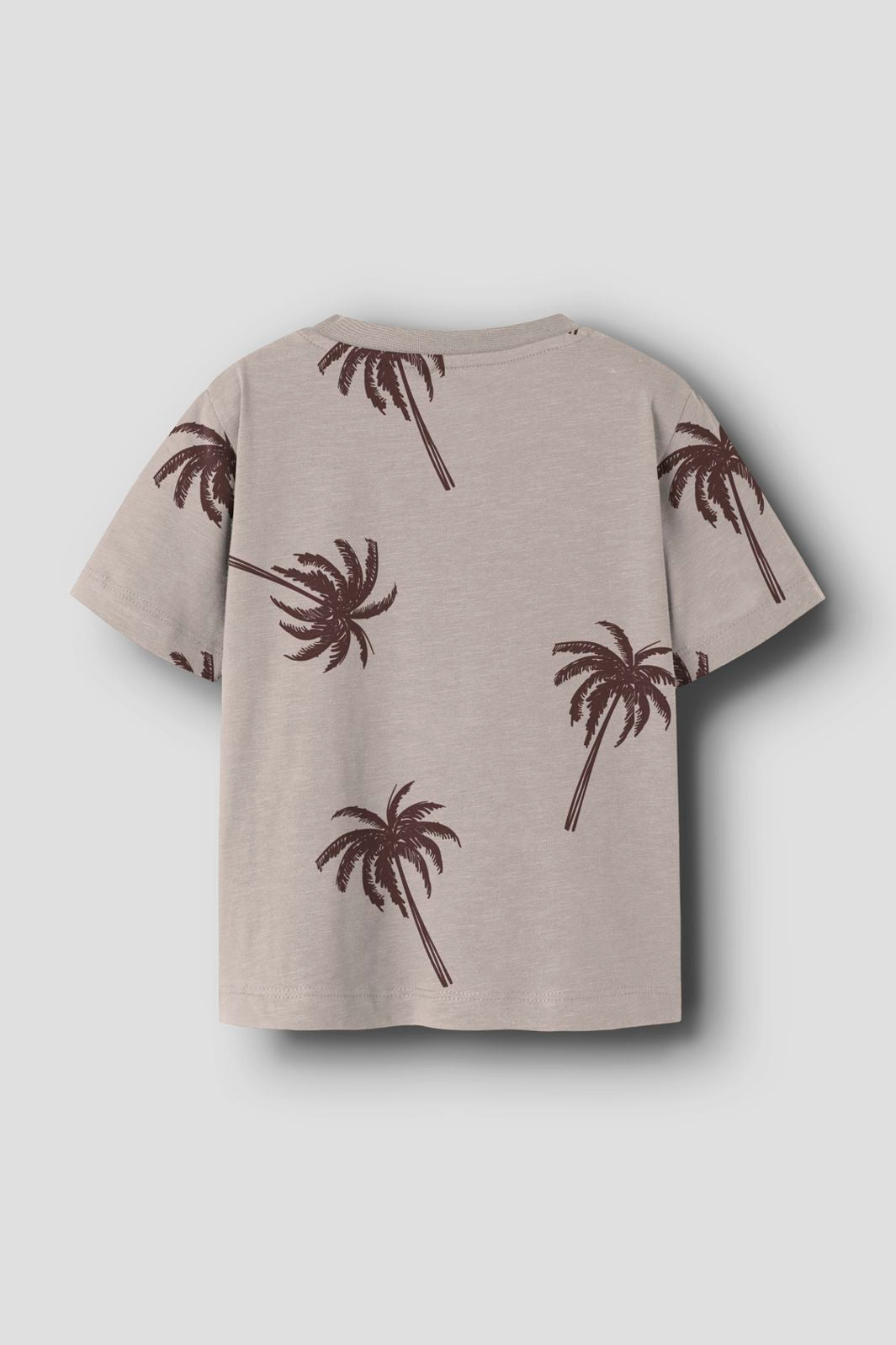 Harmaa t-paita Name Itiltä ruskeilla palmuilla. T-paidassa on pyöreä kaula-aukko ja lyhyet hihat.
