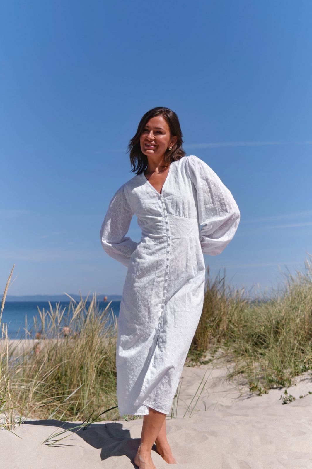 Valkoinen mekko Neo Noirilta broderie anglaise -laadusta. Mekossa on kukkakirjontaa koko kankaan alueella, V-pääntie ja napit edessä. Pitkissä hihoissa on puffia olkapäillä.