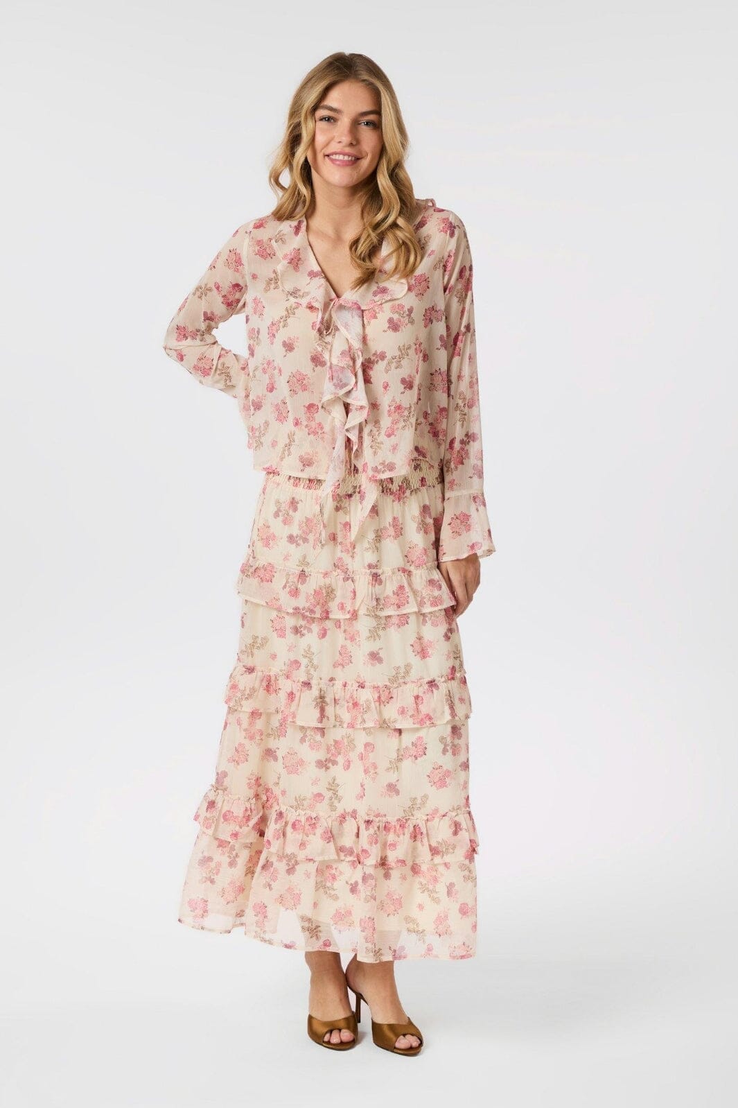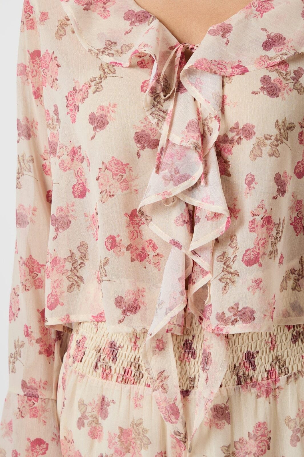 Kreeminvärinen pusero Neo Noirilta, jossa on vaaleanpunainen kukkakuosi. Puserossa on röyhelöyksityiskohtia edessä, V-pääntie nauhalla ja pitkät hihat laajennetuilla manseteilla.