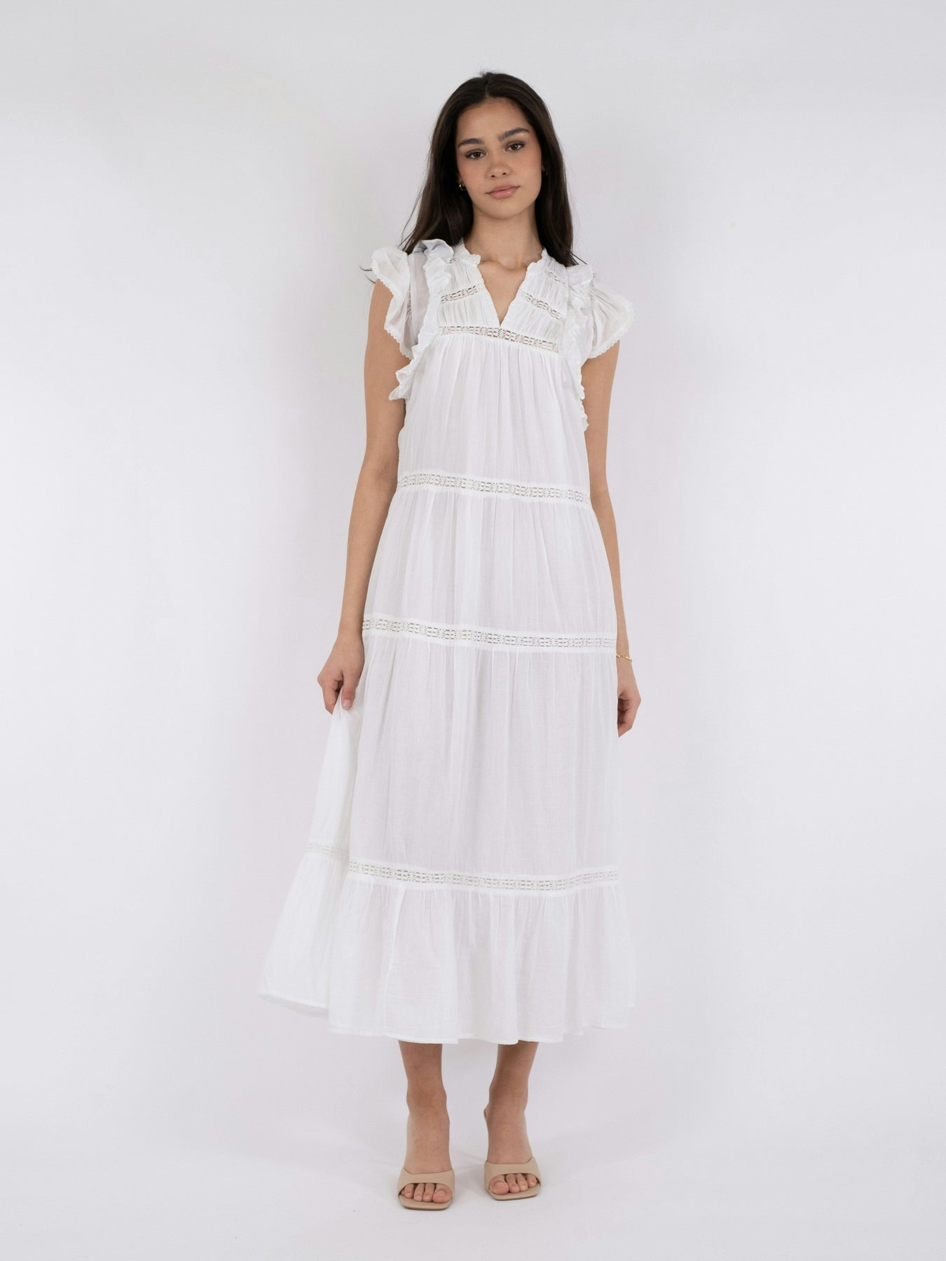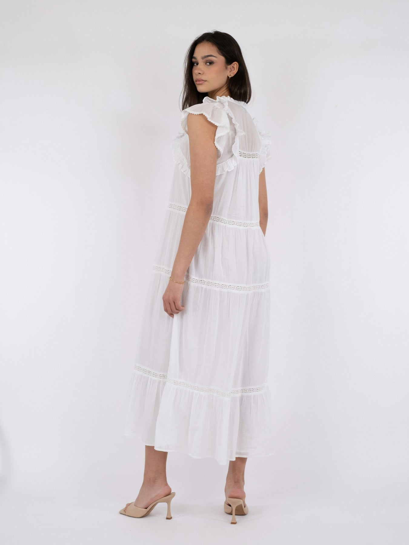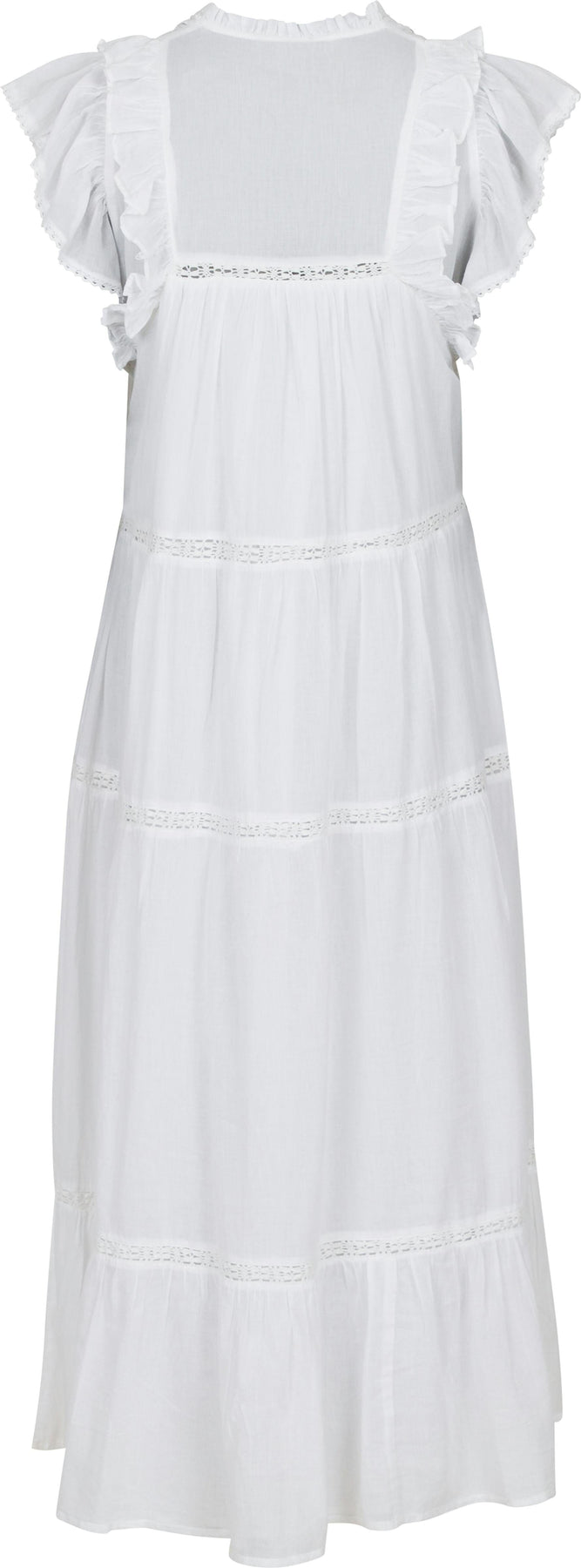 Valkoinen voile-mekko kevyestä, ilmavasta puuvillakankaasta, jossa on brodeerattuja yksityiskohtia. Mekossa on V-pääntie ja lyhyet volyymimäiset hihat. Naisellinen pituus polviin tekee siitä monikäyttöisen eri tilaisuuksiin.