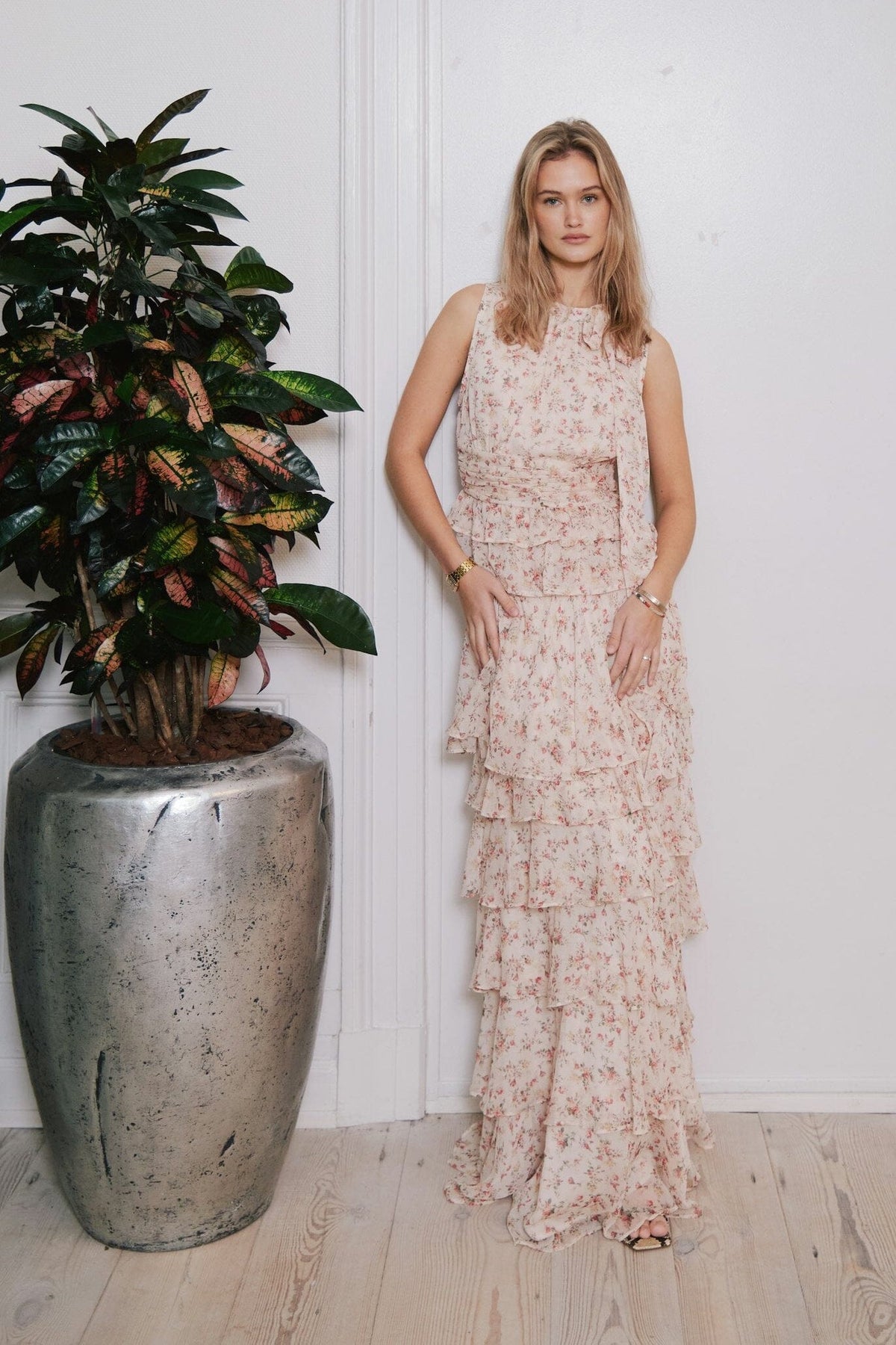 Hihaton toppi Neo Noirilta, jossa on kukkakuvio vaaleanpunaisen ja vihreän sävyissä kermanvärisellä taustalla. Topissa on korkea pääntie ja kapea istuvuus.
