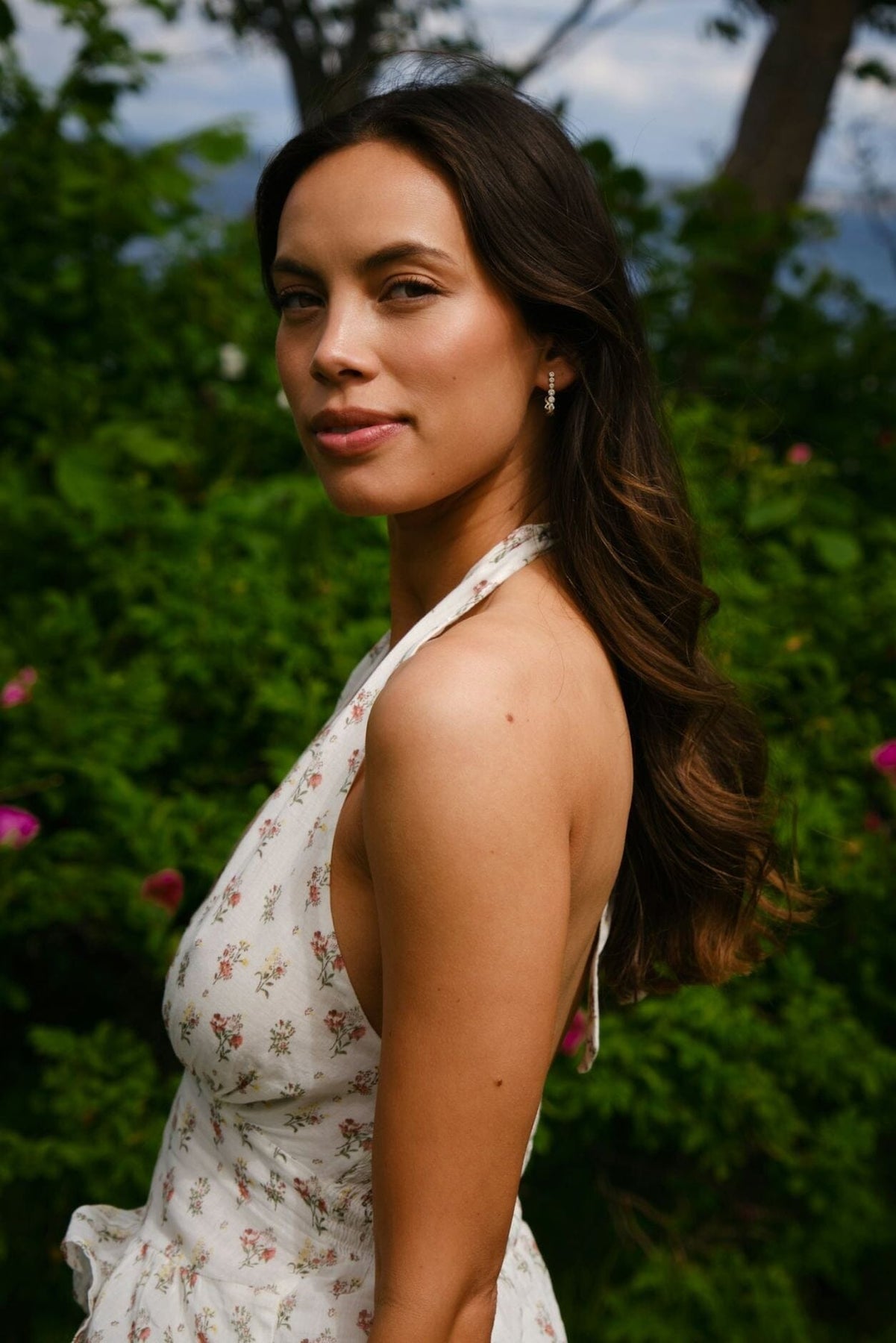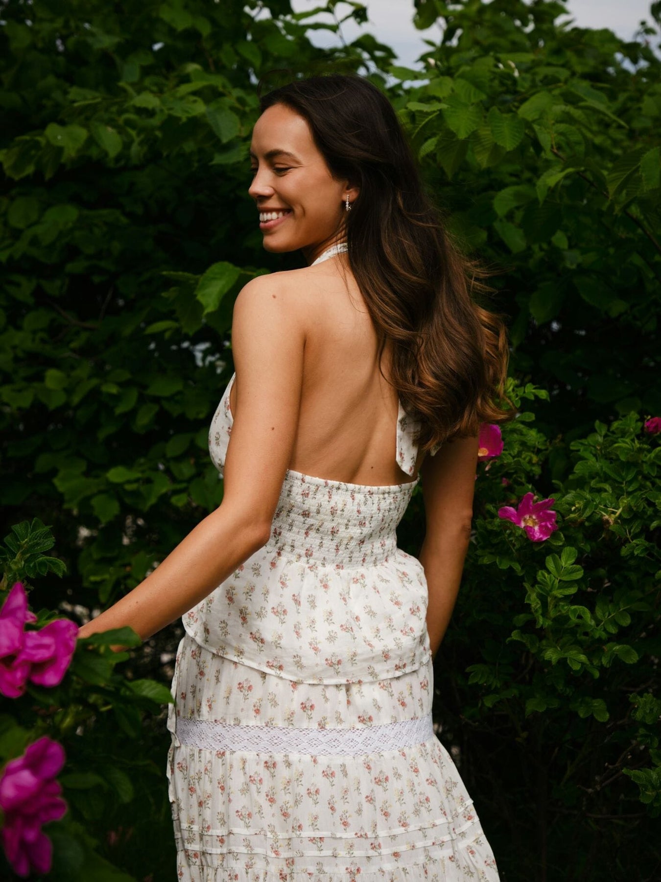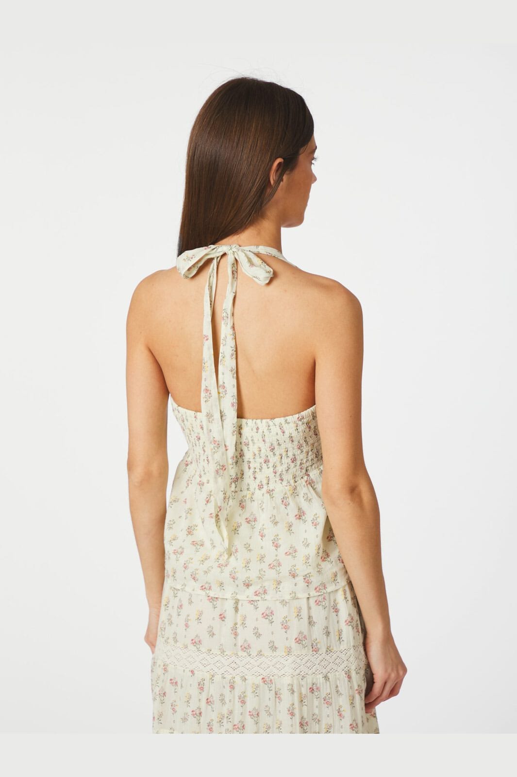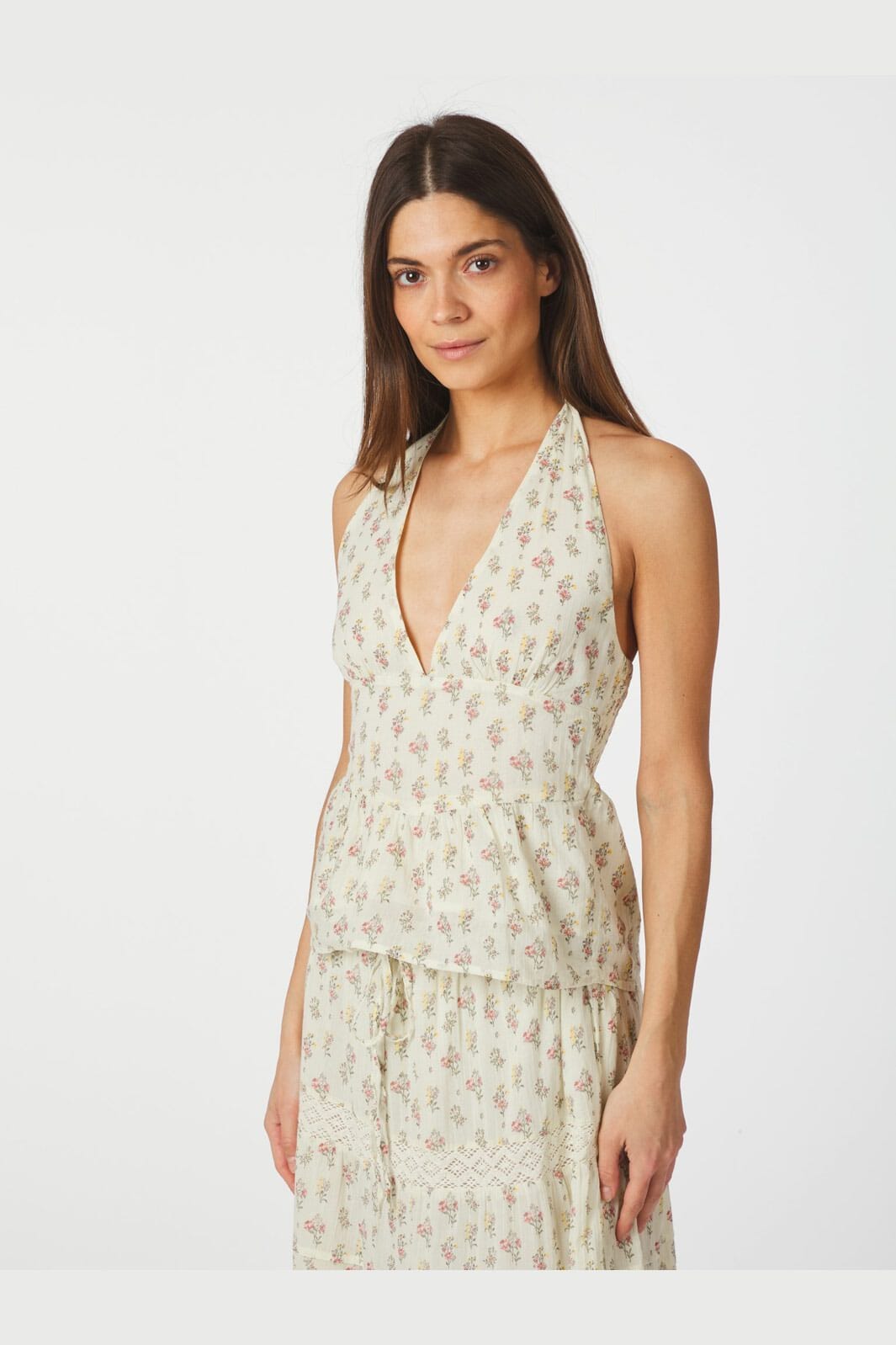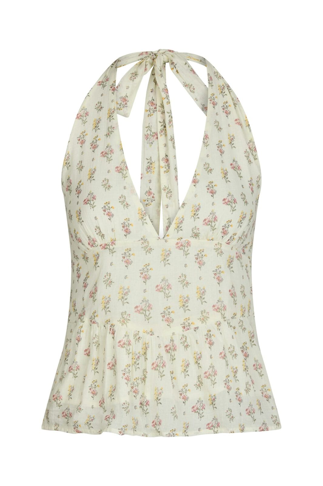 Kreeminvärinen halterneck-top Neo Noirilta, jossa on pieni kukkakuosi. Topilla on löysä malli, jossa on röyhelöreuna alhaalla ja niskassa säädettävä nauha.