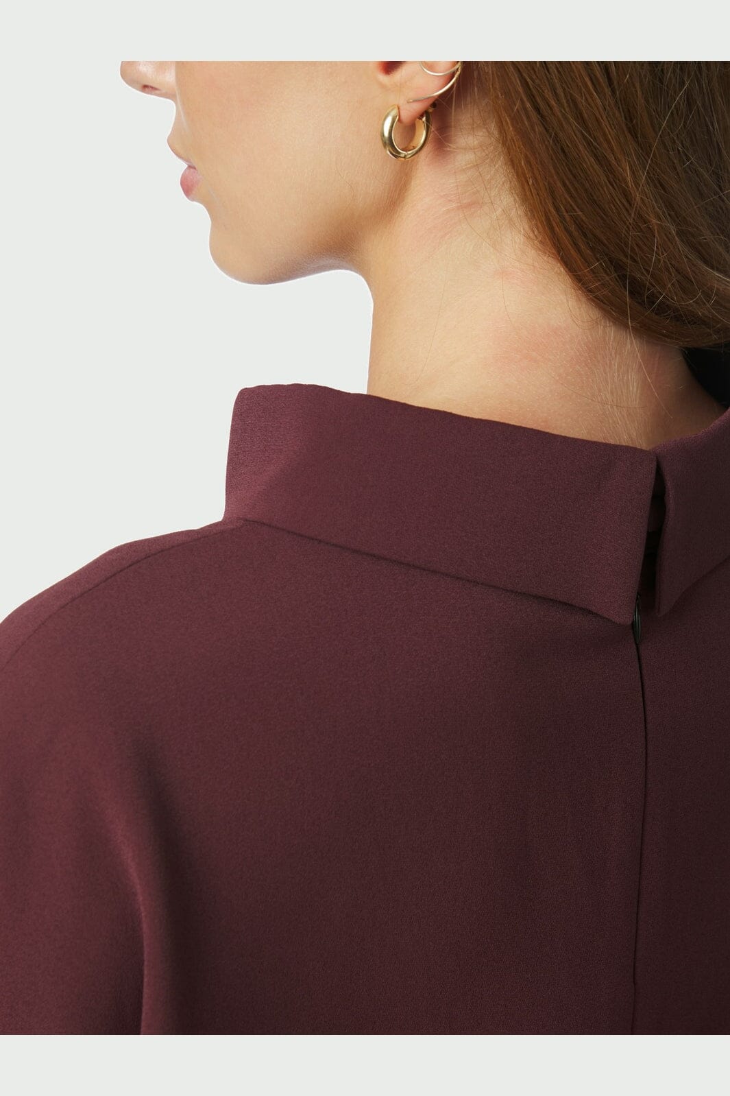 Bordeaux-värinen jumpsuit Neo Noirilta pehmeästä crepe-laadusta. Siinä on leveät lahkeet, käytännölliset taskut ja korkea kaula-aukko. Selässä oleva vetoketju helpottaa pukemista ja riisumista.