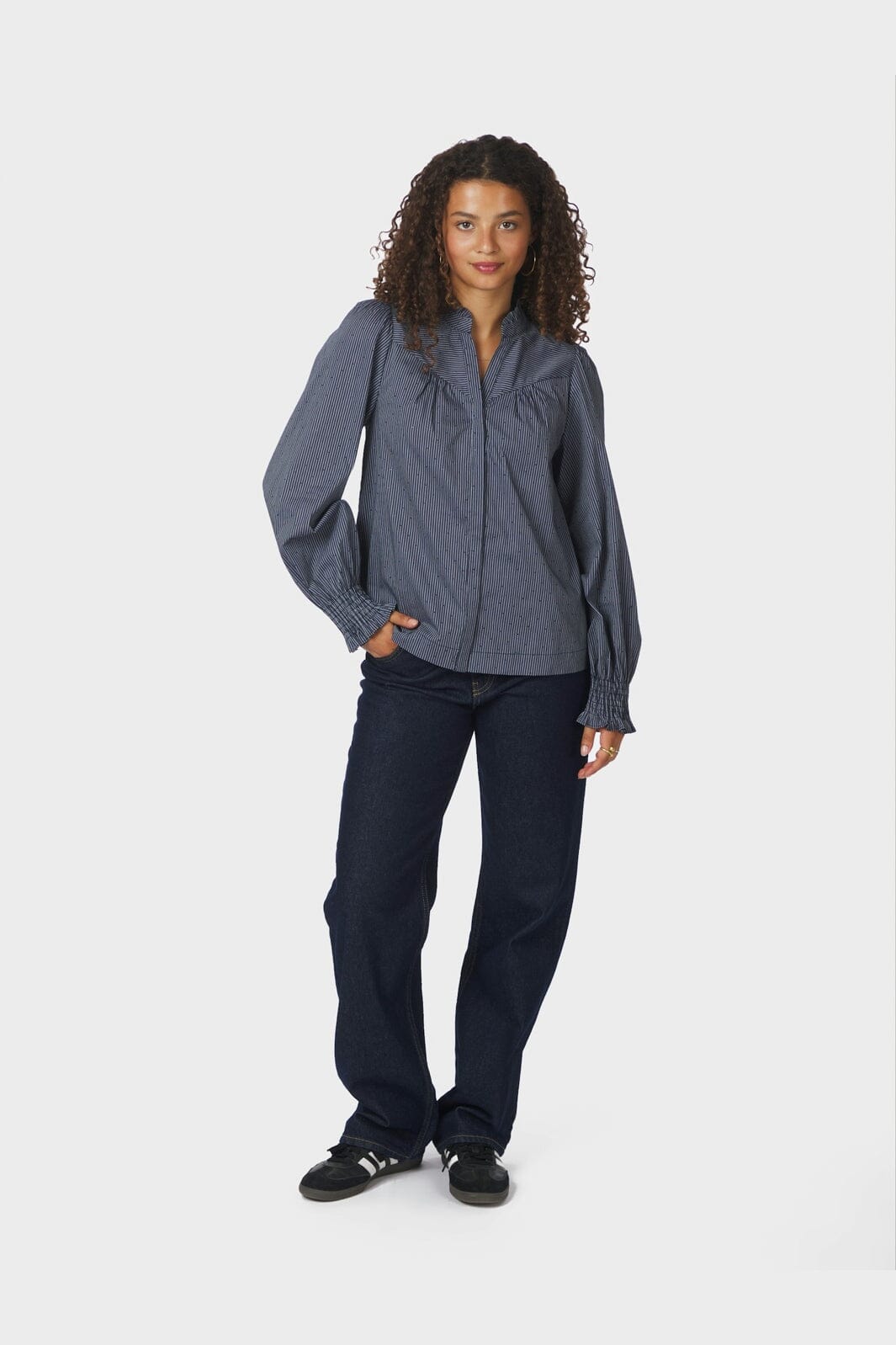 Tumma siniraitainen paita Neo Noirilta, jossa on korkea kaulus ja pitkät hihat. Paidassa on smock-mansetit ja pieni volangokaulus sekä napit edessä sulkemista varten.