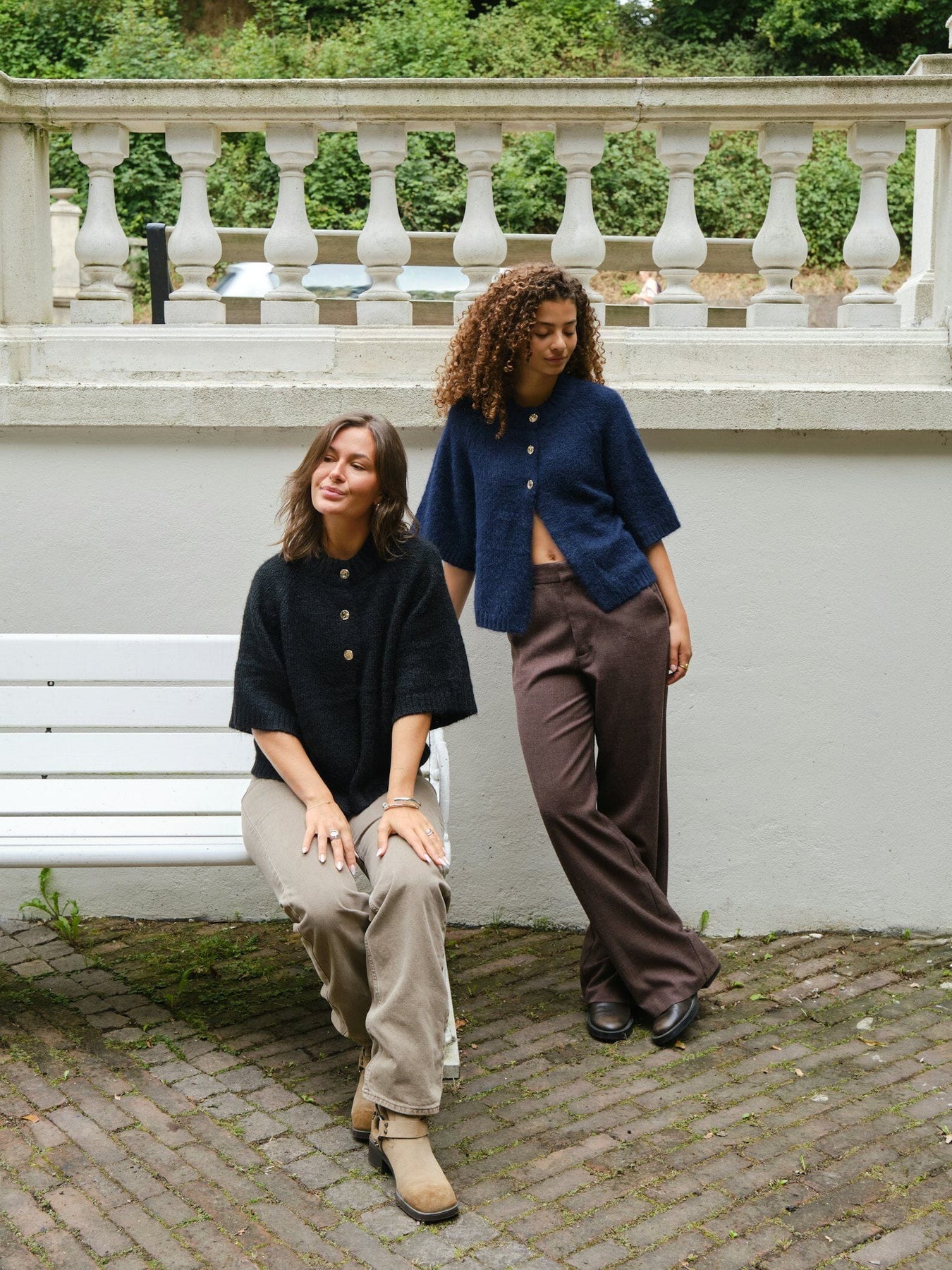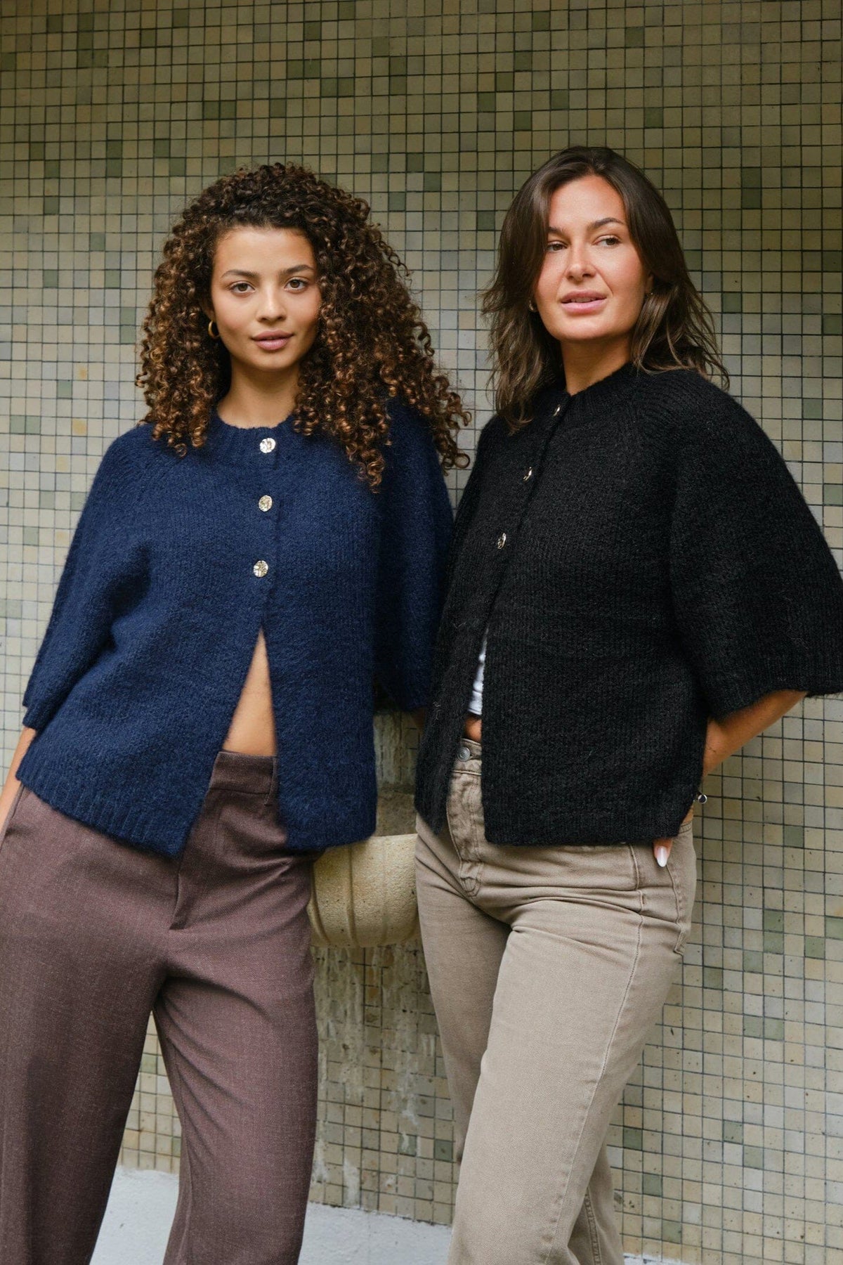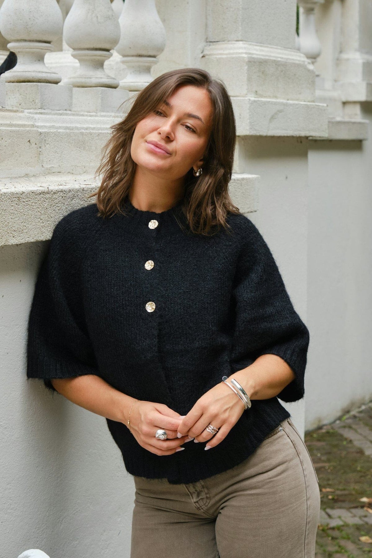 Musta cardigan Neo Noirilta pehmeässä, pörröisessä neulelaadussa. Siinä on löysä istuvuus, laatikkomainen siluetti ja lyhyet hihat. Kultaista nappia koristaa etuosa.