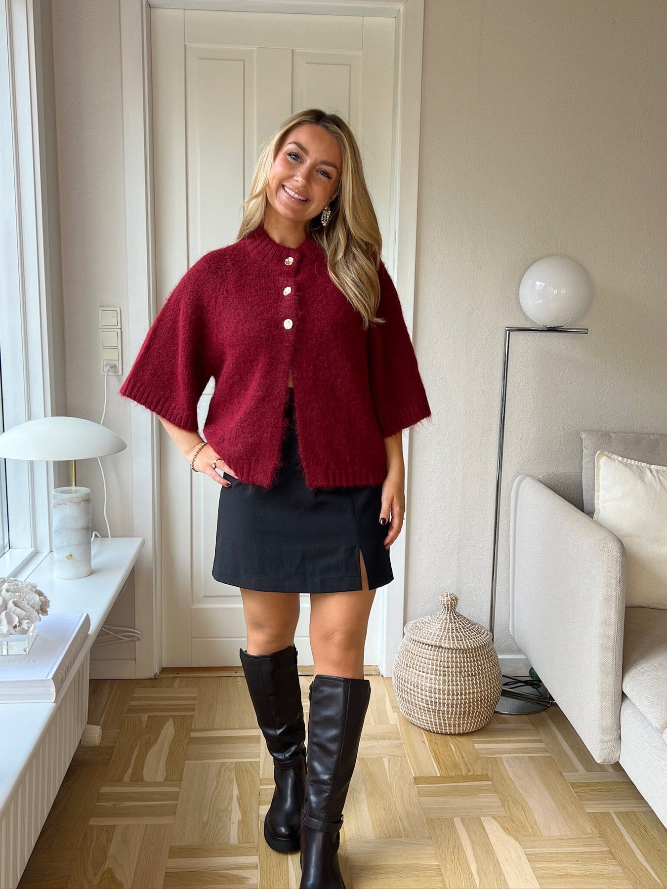 Tummanpunainen neuletakki Neo Noirilta, jossa on pörröinen neulepinta. Rentomallinen, lyhythihainen ja korkea kaulus tarjoavat hyvää liikkuvuutta niin arkeen kuin juhliin.