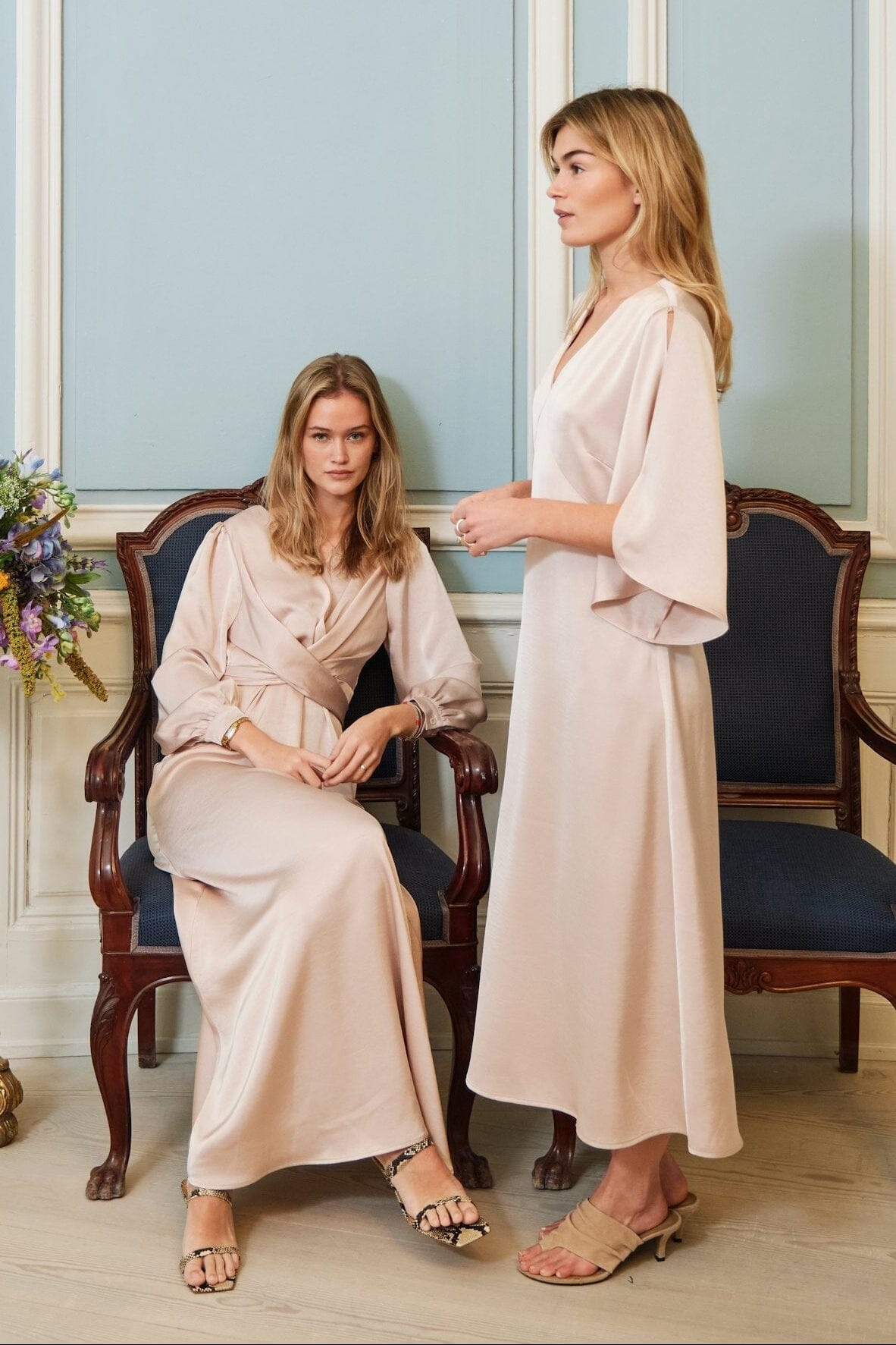 Mekko Neo Noirilta beigeen taittuvassa samppanjanvärissä. Mekossa on kietaisumalli, vyötäröllä solmittava nauha ja laskeutuva helma.
