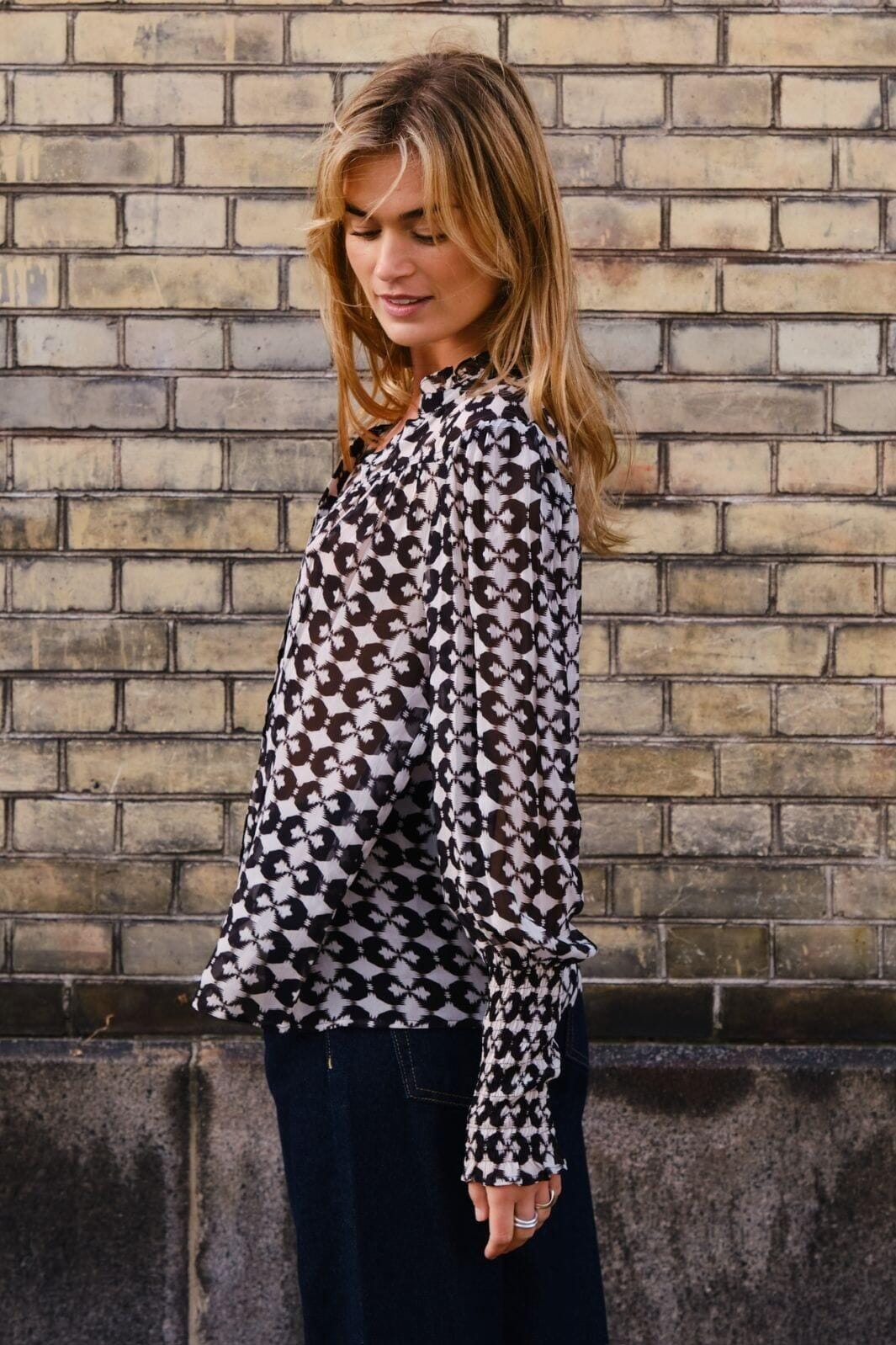 Musta paita Neo Noirilta graafisella musta-valkoisella kuviolla. V-pääntiellä ja pitkillä hihoilla varustettu paita, jota voi yhdistää sekä farkkuihin että hameeseen.