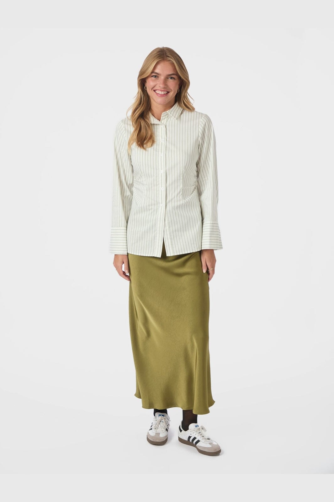 Raidallinen paita Neo Noirilta hillityn vihreänä. Paidassa on pystysuuntaiset vihreät ja kermanväriset raidat valkoisella pohjalla.