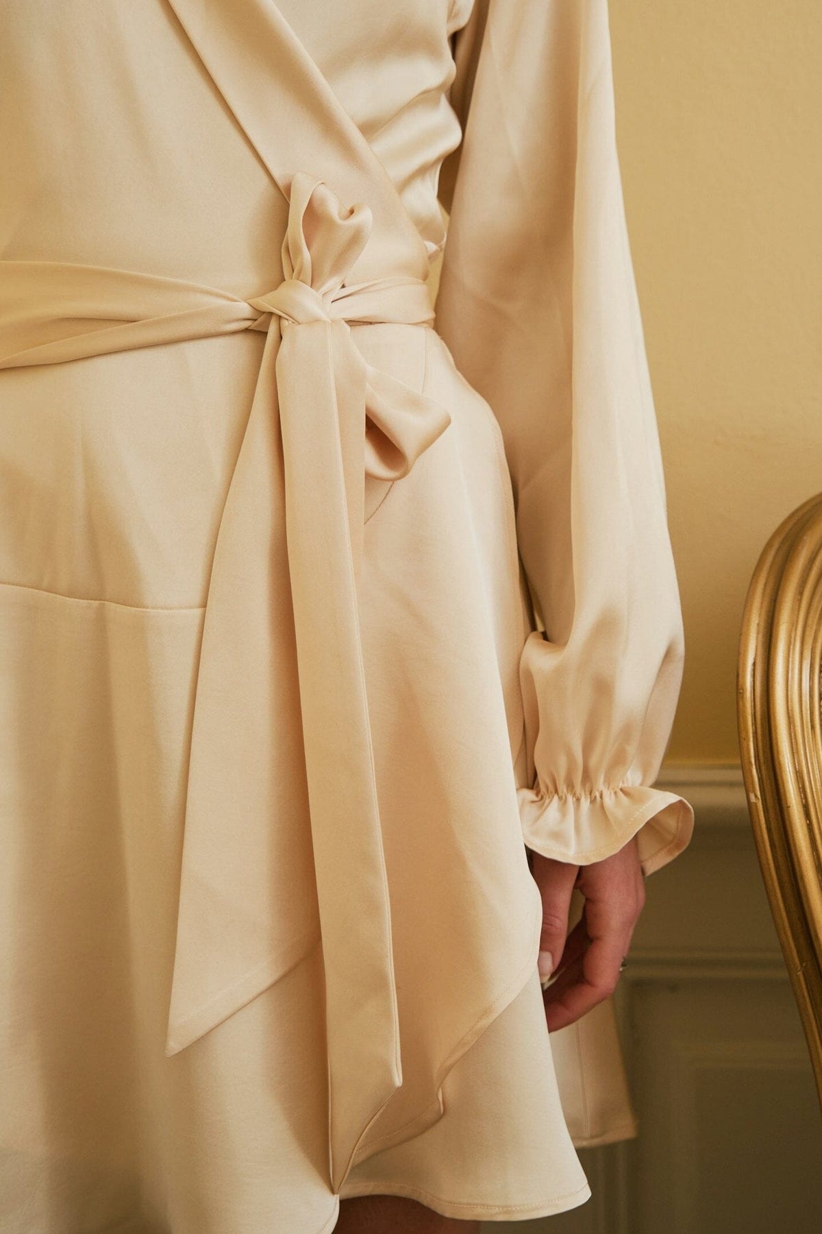 Lyhyt mekko Neo Noirilta, valmistettu raskaasta satiinista vaaleankeltaisessa sävyssä. Mekossa on V-pääntie, pitkät hihat ja kietaisumalli solmittavalla nauhalla.