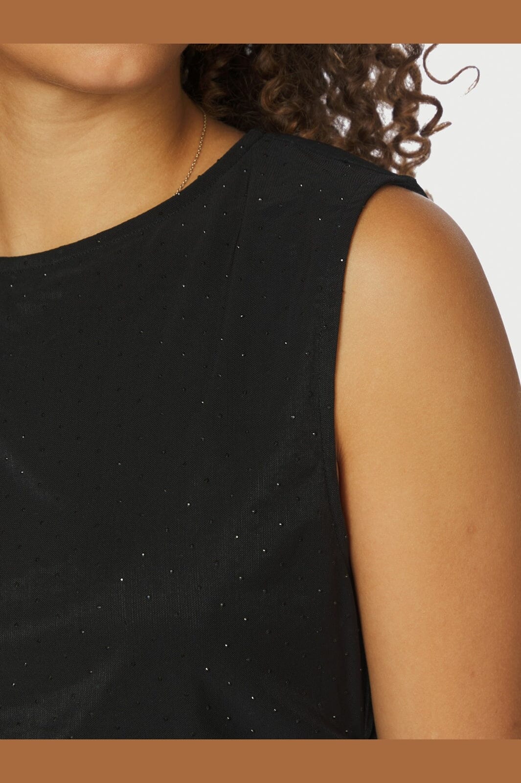 Musta verkkomekko Neo Noirilta, jossa on ommeltuja kiviä ja rypytysvaikutuksia. Mekossa on pitkä, vartalonmyötäinen malli, jossa on pyöreä pääntie ja se on hihaton.