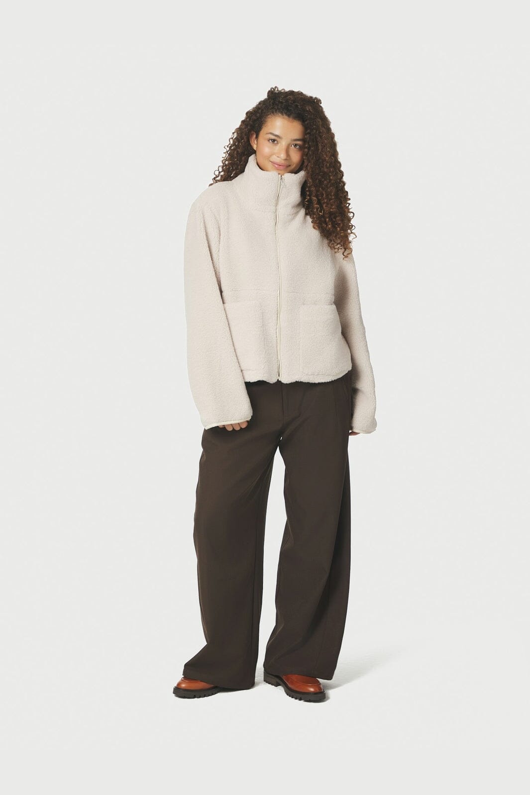 Neo Noirin teddy-takki pehmeässä norsunluun sävyssä. Takissa on korkea kaulus ja väljä istuvuus, joka sopii sekä kotiin että arkeen.
