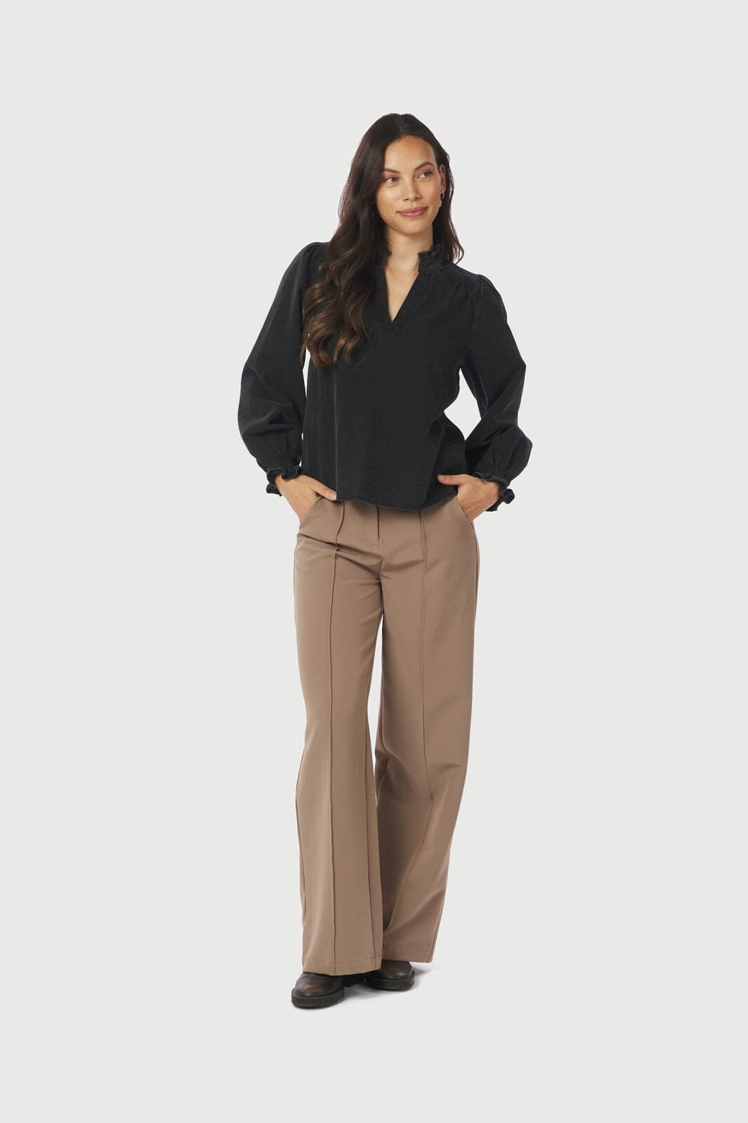 Musta denim-paita Neo Noirilta V-pääntiellä ja rypytetyllä kaula-aukolla. Paidassa on pitkät hihat, joissa on smock-hihansuut ja edessä nauhakiinnitys.