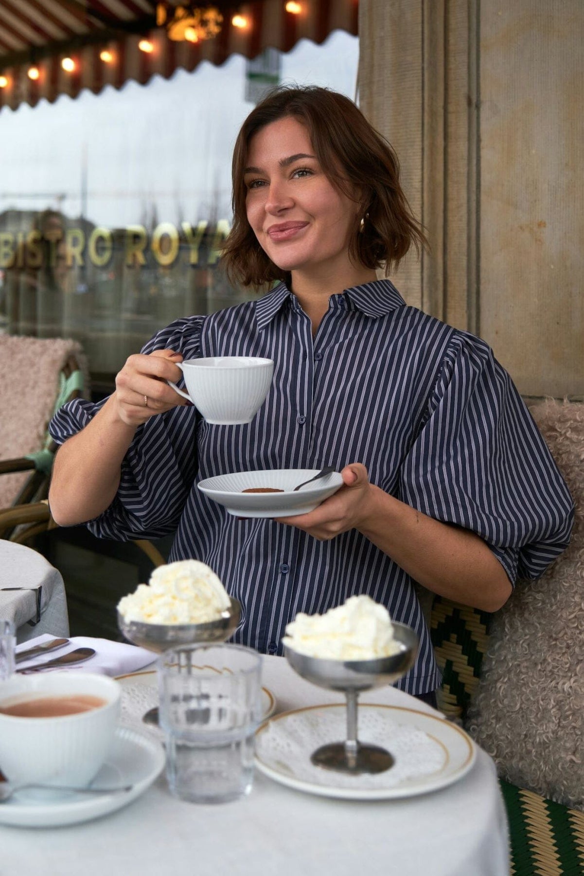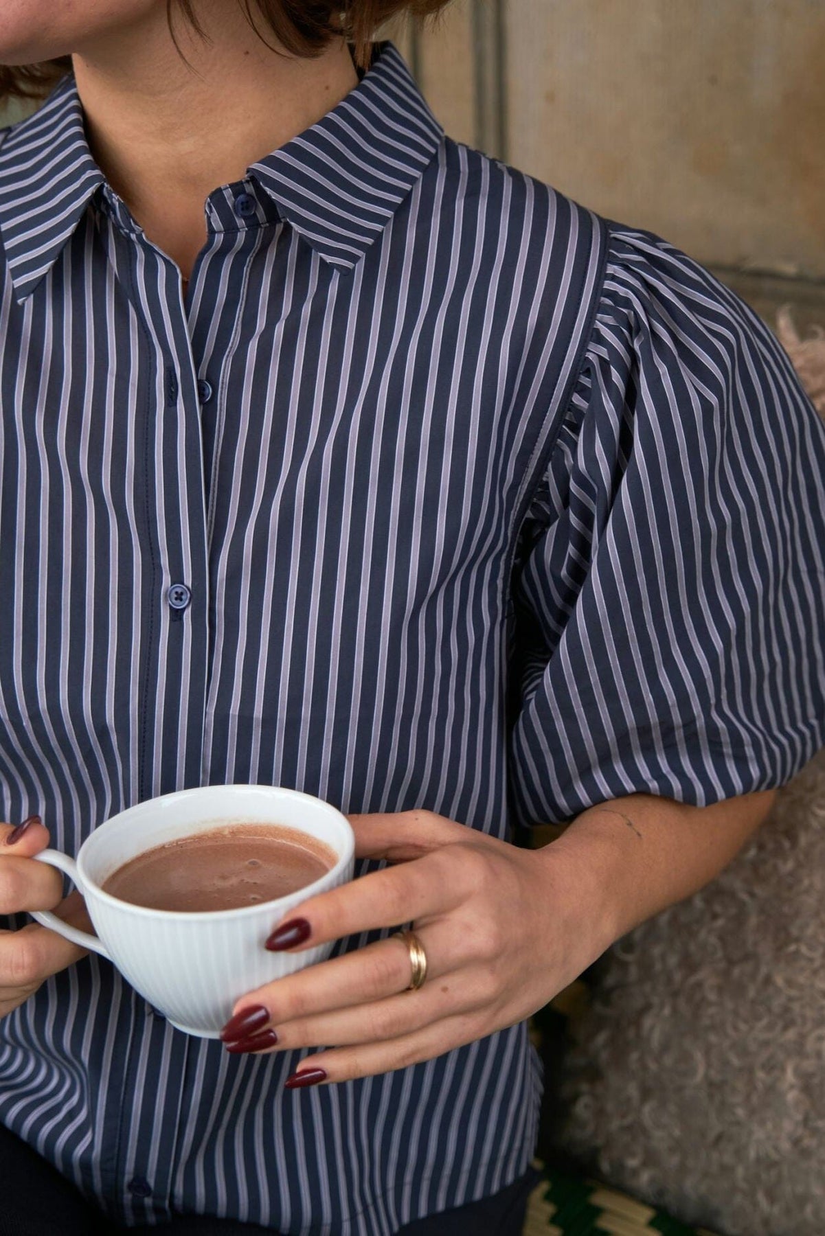 Tummansininen raidallinen paita Neo Noirilta, jossa on lyhyet puffihihat. Paidassa on pystysuorat raidat tummansinisessä ja valkoisessa, klassinen kaulus ja nappilukitus edessä.