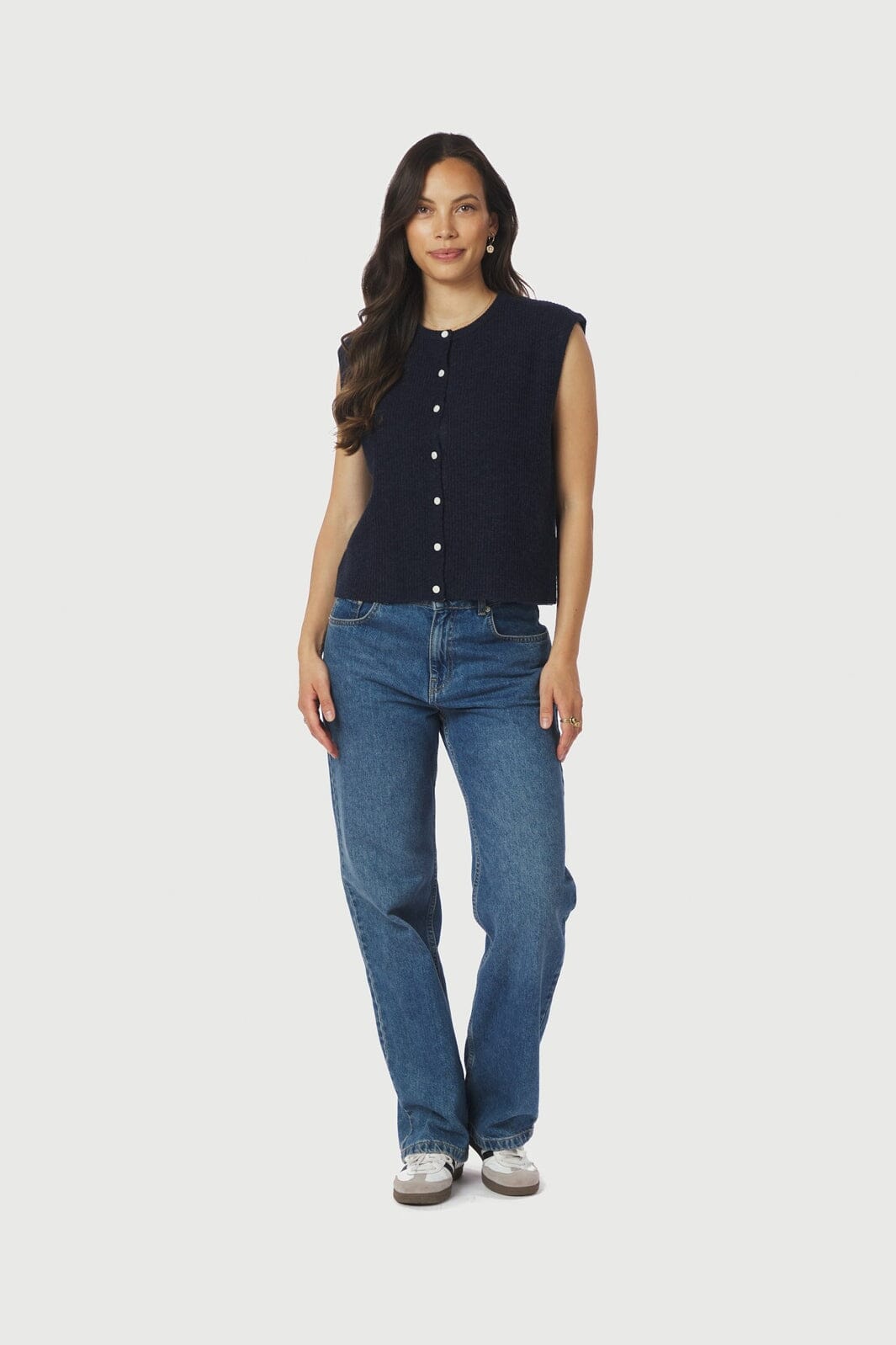 Neo Noirin neuleliivi tummansinisessä. Siinä on löysä istuvuus, pyöreä kaula-aukko ja helmiknappikiinnitys edessä.