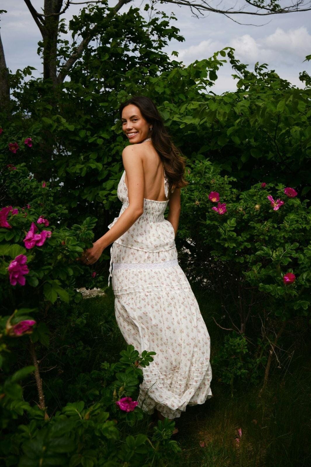Pitkä hame Neo Noirilta kermanvärisenä, jossa on pieniä vaaleanpunaisia kukkia. Hameessa on röyhelöitä ja laskoksia, jotka luovat liikettä kankaaseen, sekä joustava vyötärö, jossa on nauha.