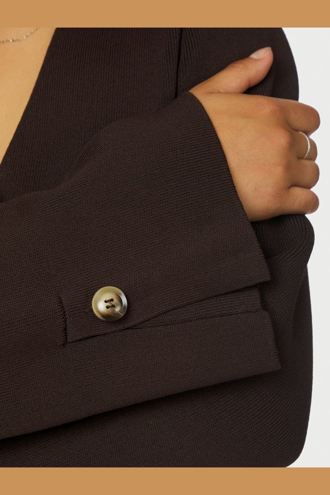 Tumma ruskea neulepaita Neo Noirilta, jossa on V-pääntie ja sarvinuppinepparit. Paidassa on tiukka istuvuus ja pitkät hihat, joissa on napit hihansuissa.