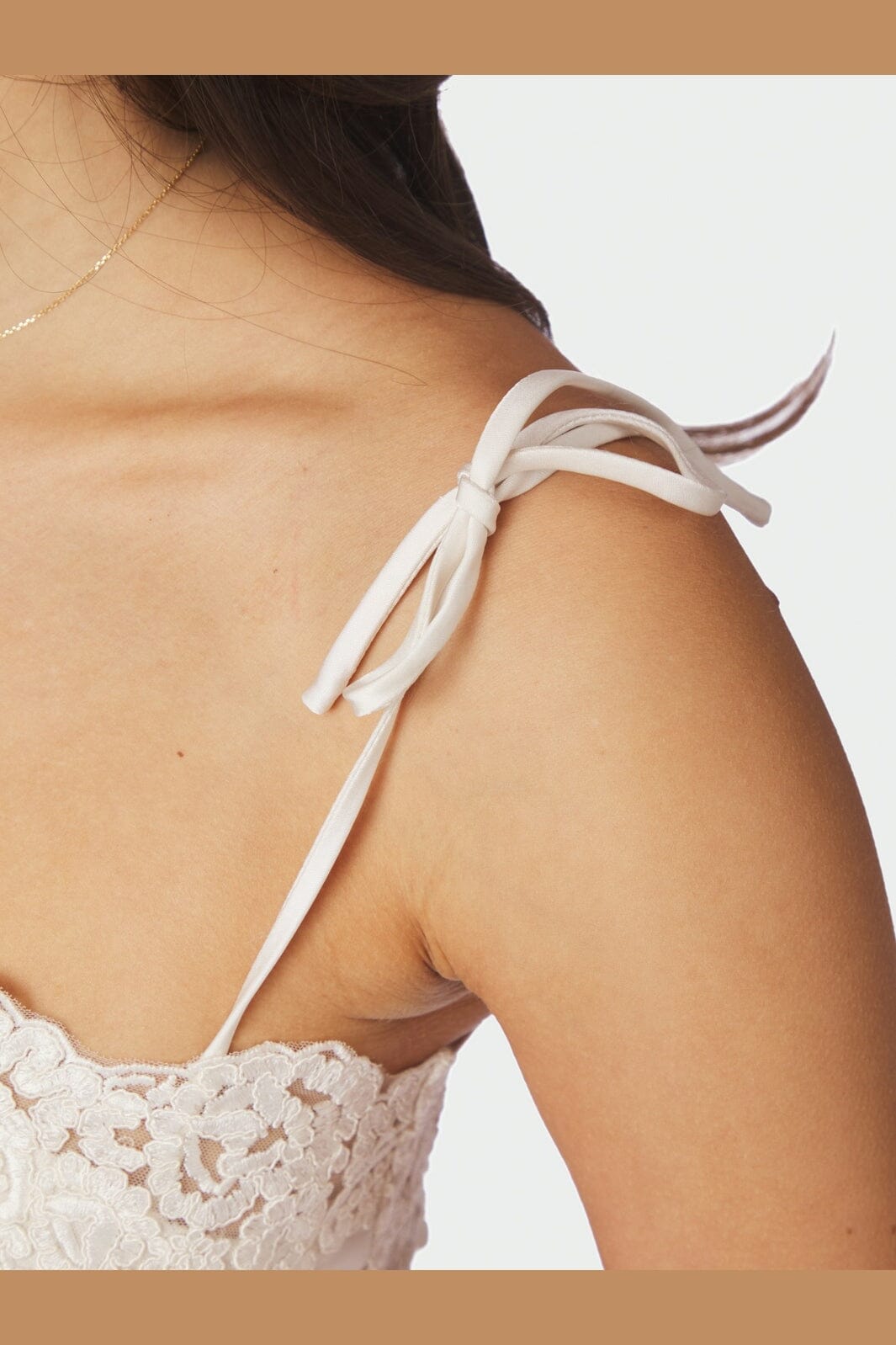 Neo Noir -toppi, joka on valmistettu raskaasta satiinista helmenvaaleassa sävyssä. Topissa on pitsiyksityiskohtia edessä ja takana sekä solmittavat olkaimet.