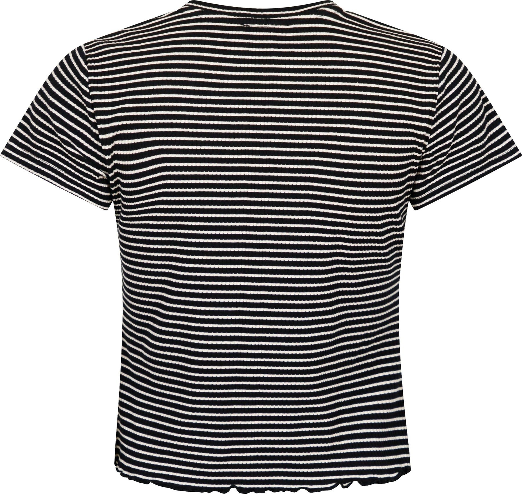 Raidallinen t-paita Neo Noirilta musta-valkoisella kuviolla. T-paidassa on pyöreä kaula-aukko ja aaltoileva helma alhaalla.