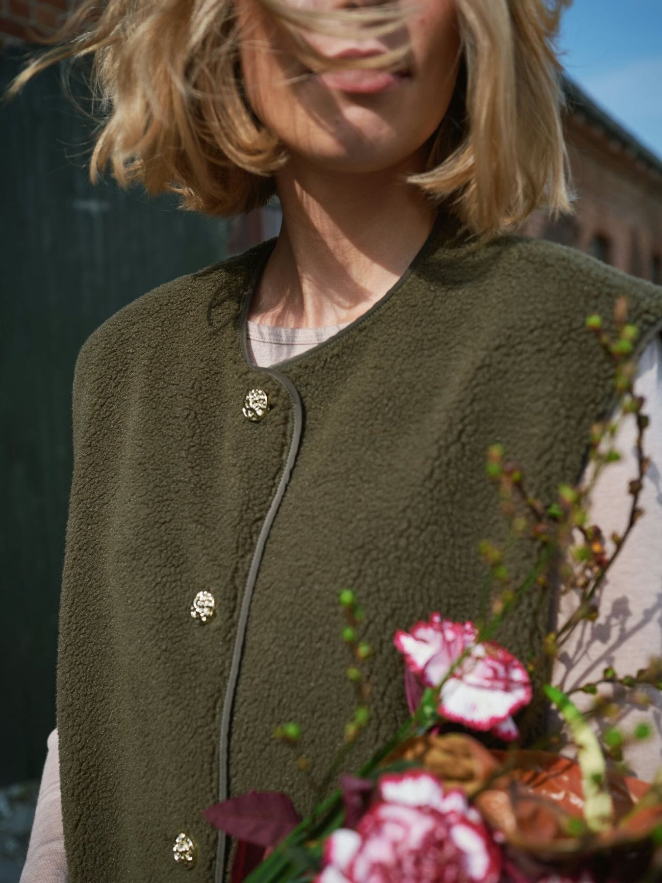 Teddyliivi Neo Noirilta armeenvihreänä pehmeästä kankaasta. Liivissä on rento malli ja se suljetaan edessä neljällä kultanapilla. Pyöreä kaula-aukko antaa yksinkertaisen ilmeen.