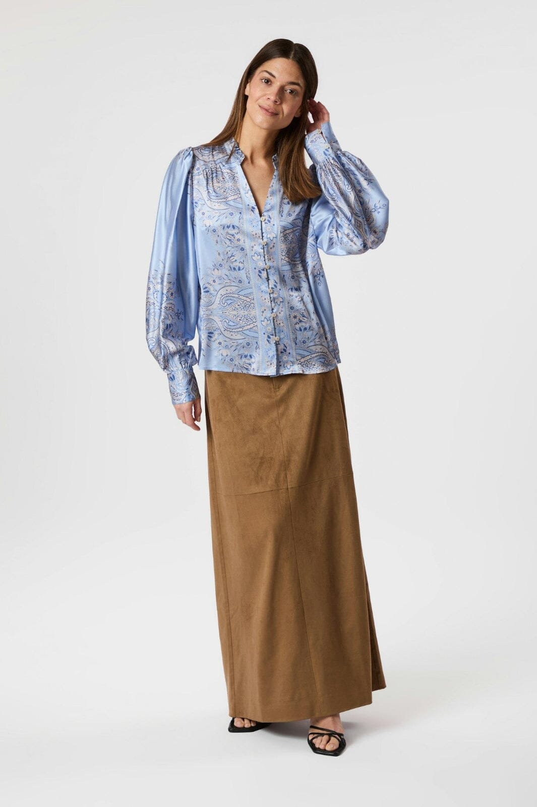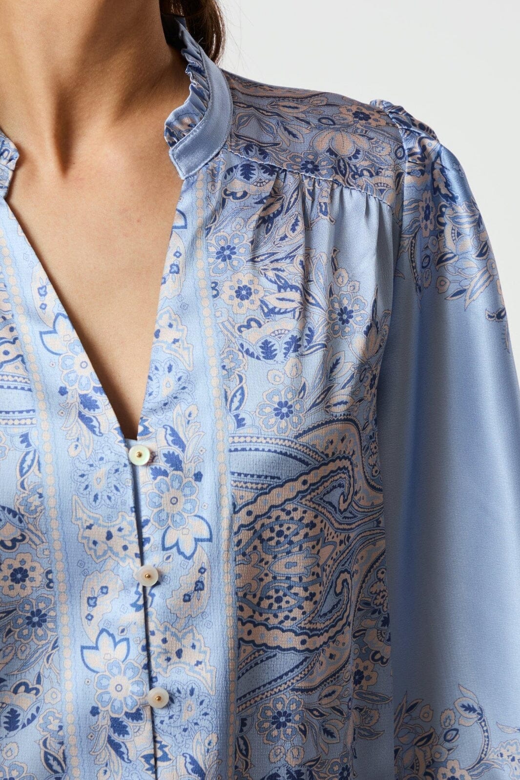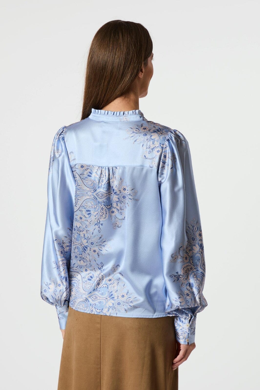 Vaaleansininen paita Neo Noirilta paisley-kuvioilla ja röyhelöyksityiskohdilla. Siinä on pitkät hihat ja V-pääntie nappikiinnityksellä edessä.