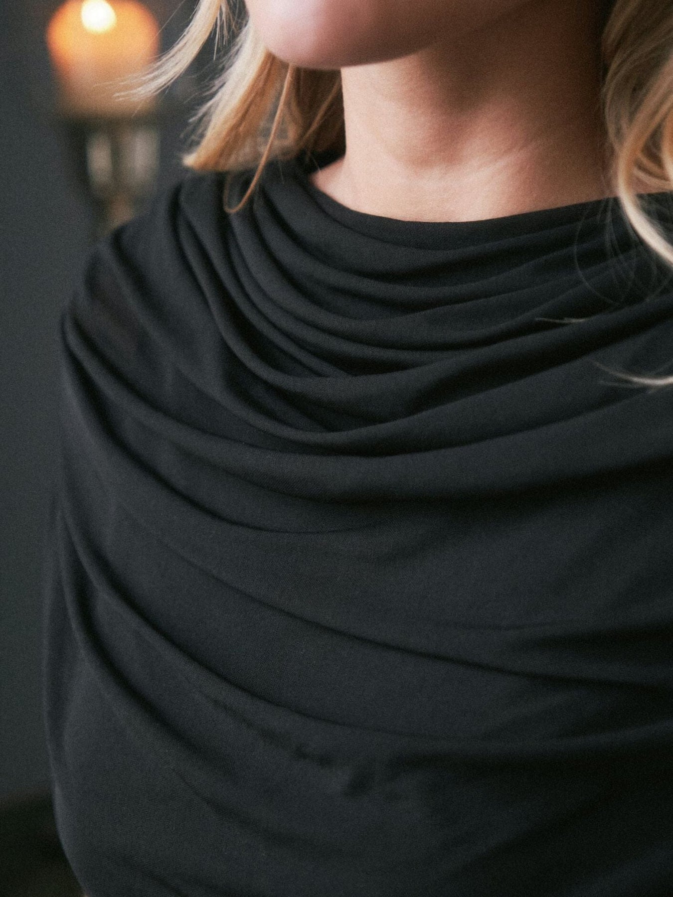 Musta verkkomekko Neo Noirilta drapeeratulla designilla. Mekossa on ryppyjä sivusaumassa ja edessä vesiputousvaikutus, joka luo liikettä kankaaseen.