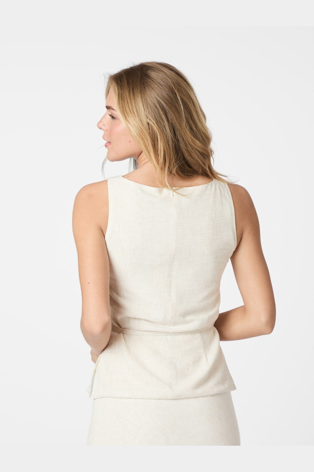 Neo Noirin hihaton toppi luonnollisessa värissä. Siinä on peplum-muotoilu vyötärön nauhalla ja pyöreä pääntie. Selässä oleva vetoketju tekee sen pukemisesta ja riisumisesta helppoa.