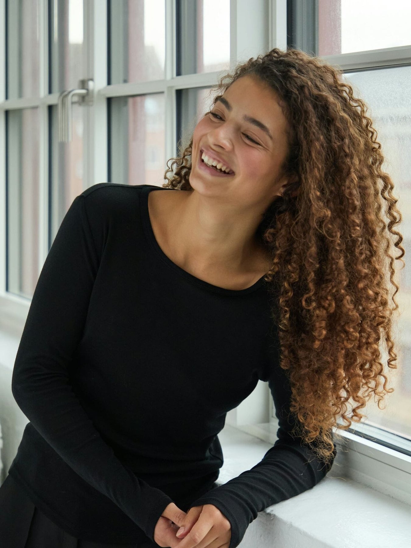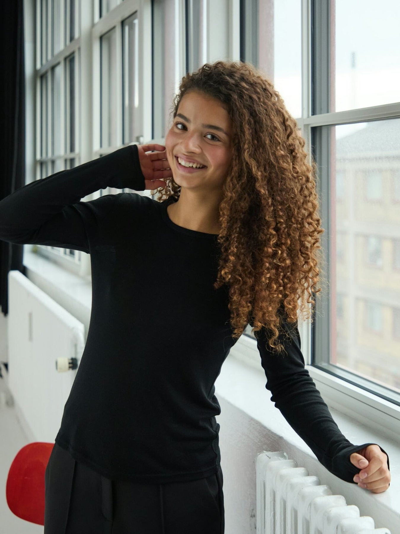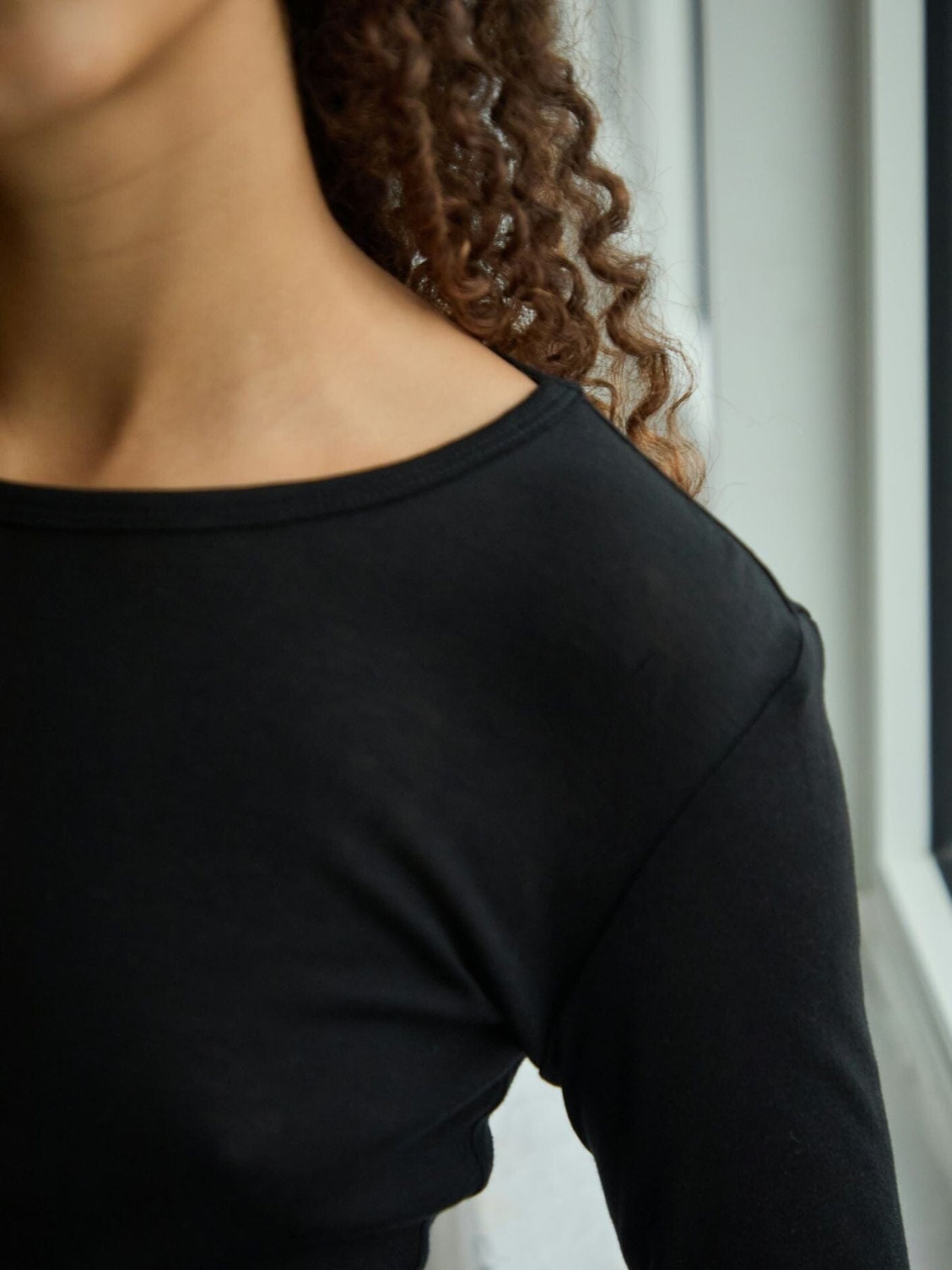 Musta ribbipaita Neo Noirilta pehmeästä lyocellin ja villan sekoituksesta. Paidassa on tiukka istuvuus, pitkät hihat ja pyöreä kaula-aukko.