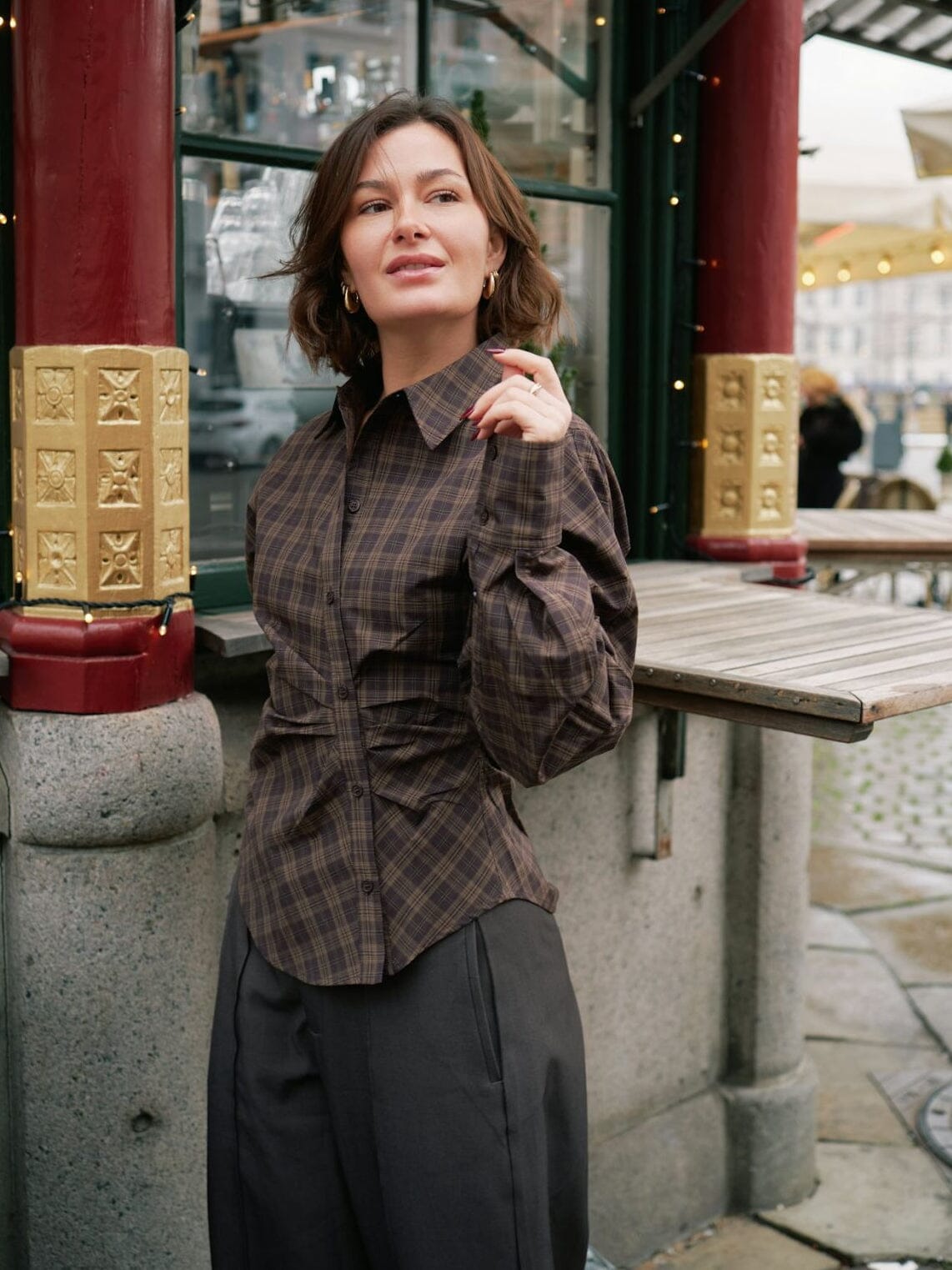 Neo Noirin tummanruskea ruudullinen paita, jossa on epäsymmetrinen nappilukitus. Paidassa on klassinen kaulus ja rypytysdetaljeita, jotka antavat sille ainutlaatuisen ilmeen.