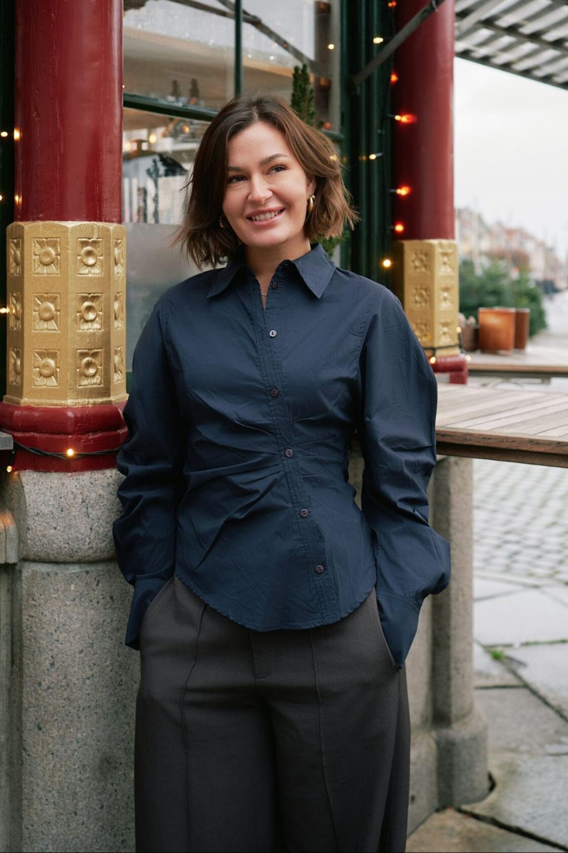 Tummansininen paita Neo Noirilta, jossa on epäsymmetrinen nappilukko edessä. Paidassa on slim fit -malli ja rypytettyjä yksityiskohtia vyötäröllä sekä pitkät hihat puffilla.