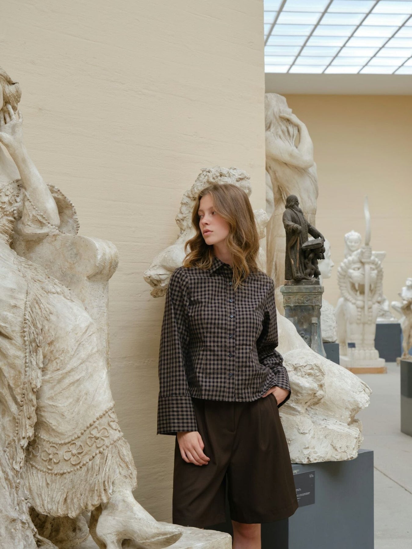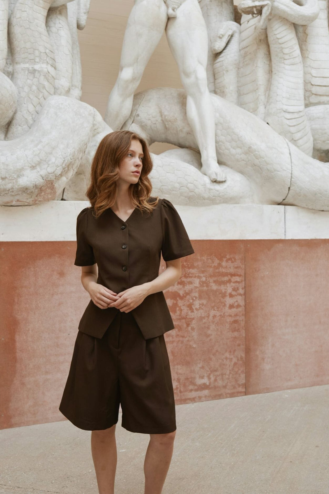 Tummanruskeat shortsit Neo Noirilta, joissa on leveät lahkeet ja laskokset edessä. Shortseissa on korkea vyötärö ja löysä istuvuus, joka tarjoaa hyvää liikkuvuutta.