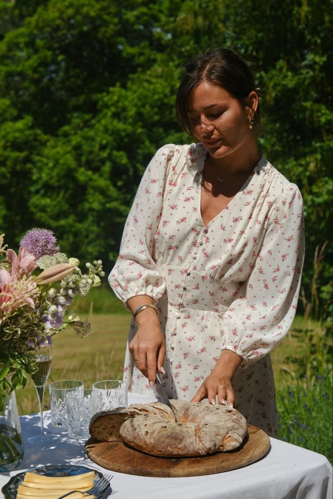 Kukallinen mekko Neo Noirilta, jossa vaalealla pohjalla vaaleanpunaisia kukkia. Mekossa on V-pääntie, 3/4 puffihihat ja napit edessä.