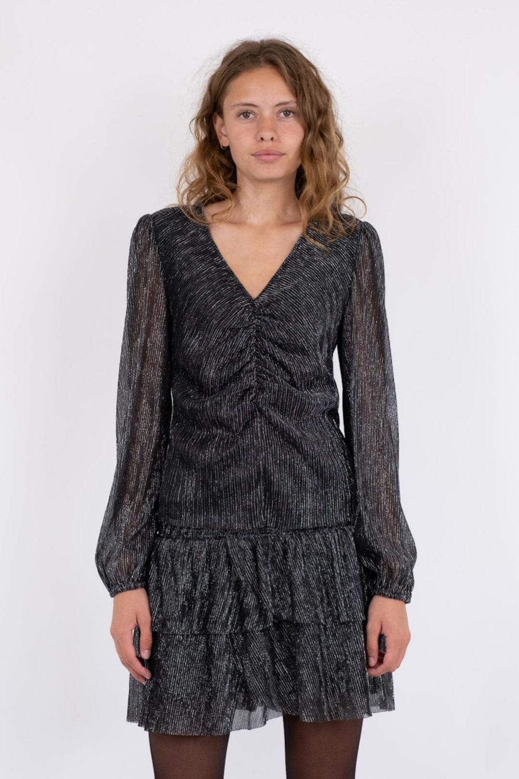 Hopeinen paita Neo Noirilta, jossa on kiiltävä glitterefekti ja vuori. Siinä on rypytysdetailit edessä ja pitkät hihat, joissa on puffidetailit olkapäillä.