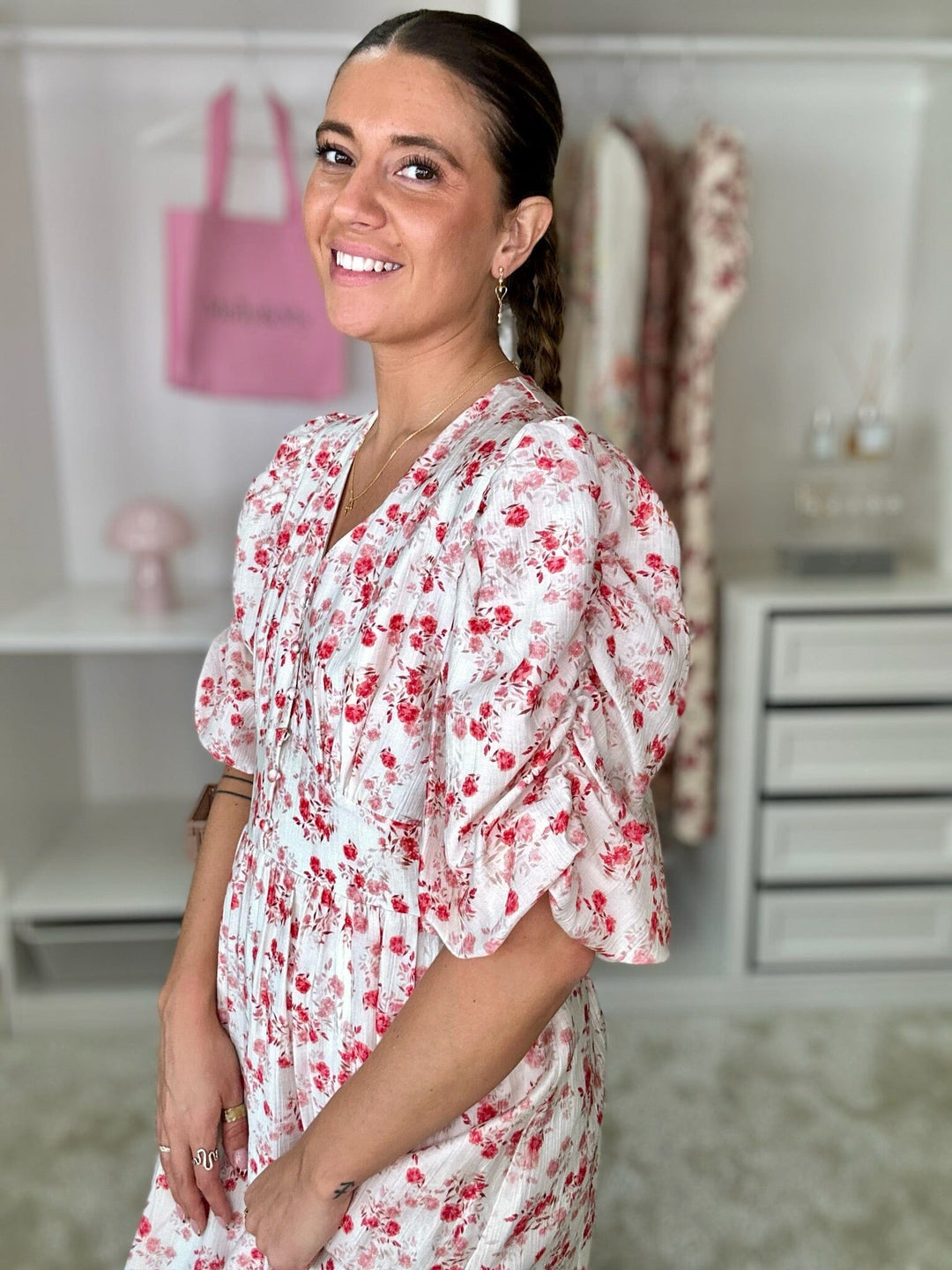Pitkä kukkamekko Neo Noirilta punaisella kuviolla valkoisella pohjalla. Mekossa on puffihihat, V-pääntie ja kerroksellinen hame, jossa on röyhelöitä.