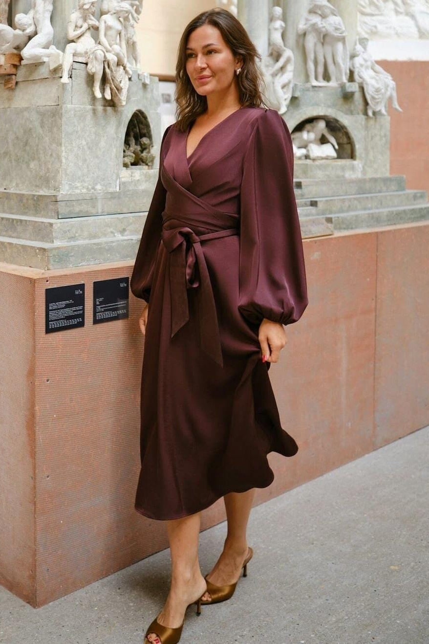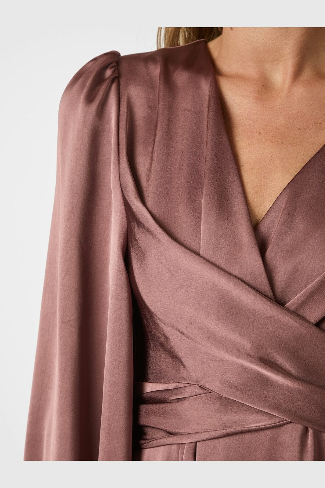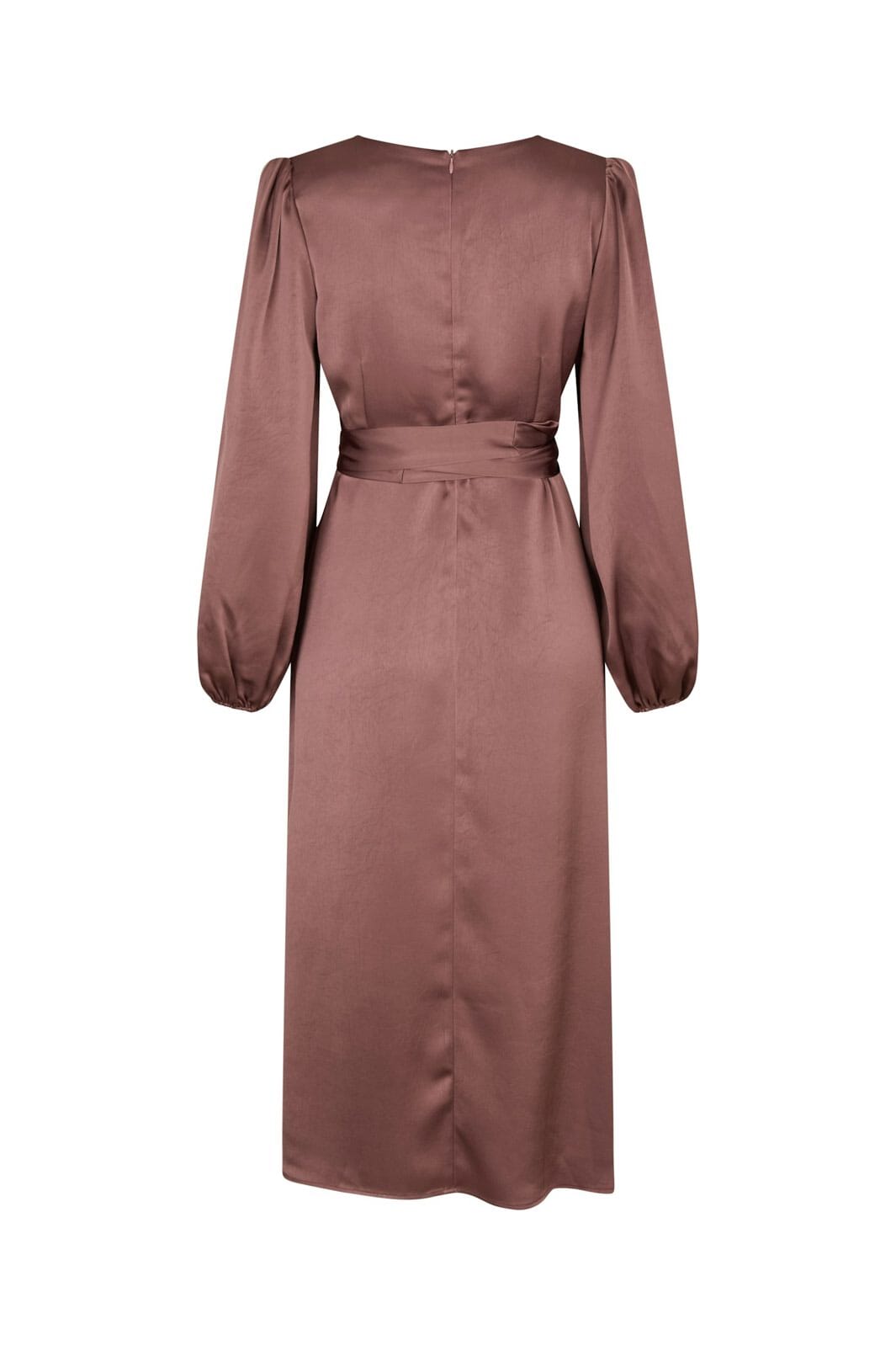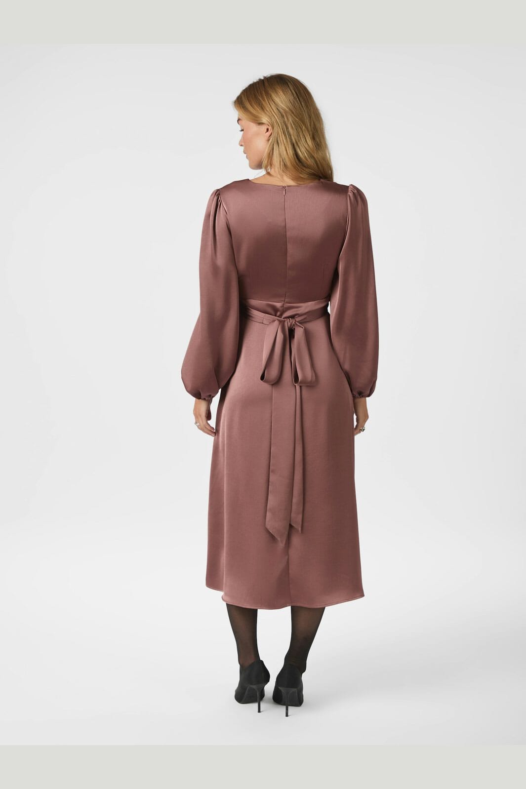 Satiini mekko Neo Noirilta tumman vaaleanpunaisena. Mekossa on V-pääntie, pitkät hihat kerättyine rannekkeineen ja kietaisumalli, jossa on vyö vyötäröllä.