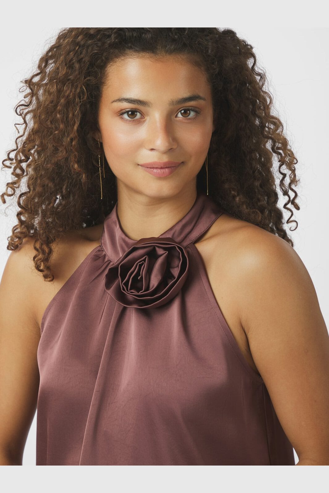 Sateen-top Neo Noirilta tumman vaaleanpunaisena. Topissa on korkea kaulus halterneck-muotoilulla ja koristeellinen ruusu kauluksessa. Se on valmistettu hienosta satiinista, jossa on sileä pinta.