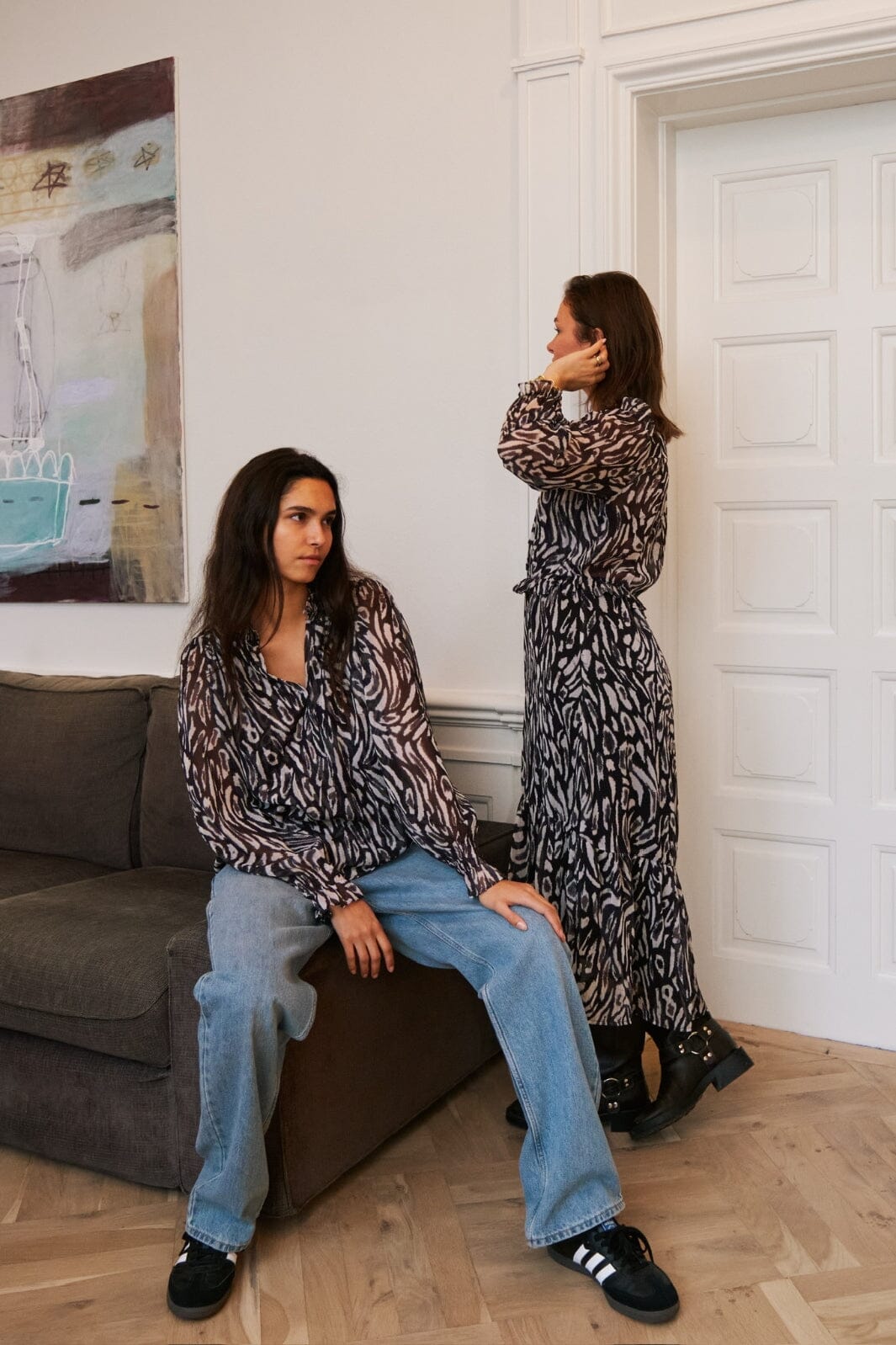Musta ja valkoinen mekko Neo Noirilta abstraktilla leopardikuviolla. Mekossa on V-pääntie, pitkät hihat ja se ulottuu polven keskelle. Helmat ja nauhat antavat mekolle erityisen ilmeen.