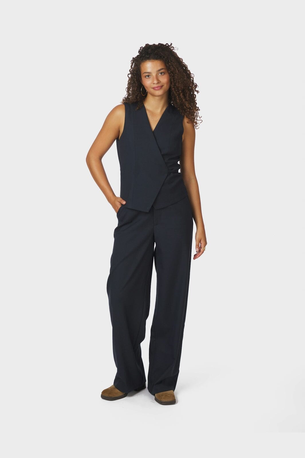 Tummansininen liivi Neo Noirilta, jossa on V-pääntie ja slim fit -leikkaus. Siinä on vyötäröllä sidontanauha ja melange-kangas, joka antaa rakenteen suunnittelulle.