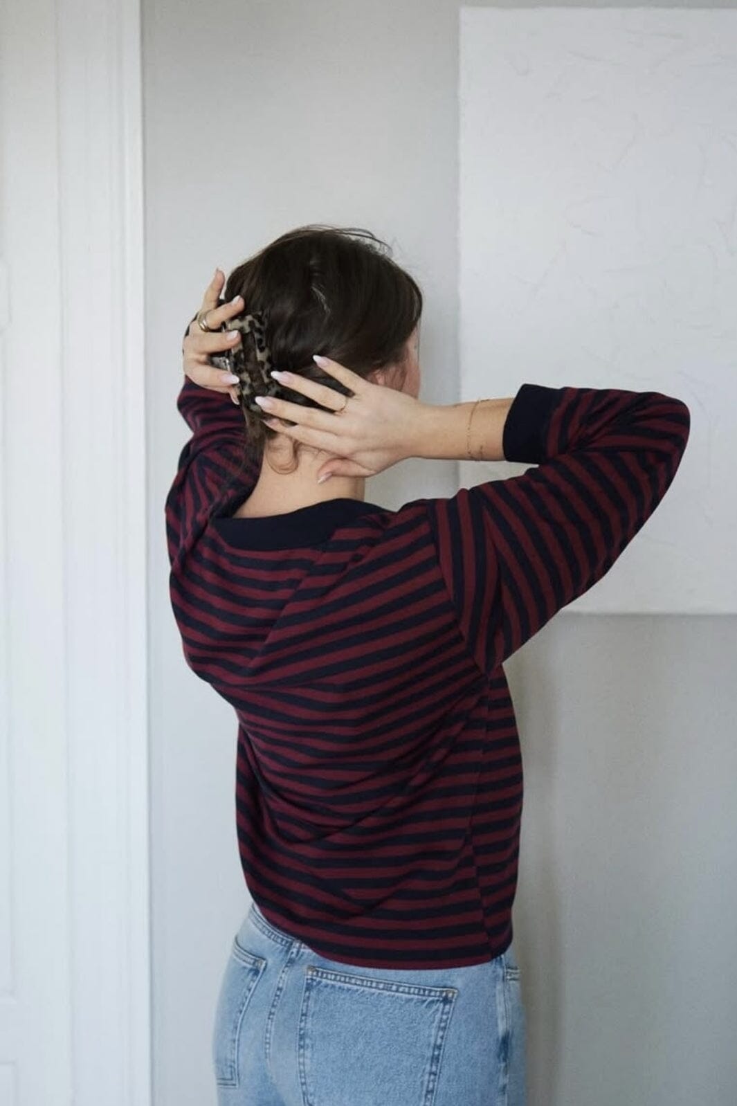Raidallinen polo-paita Neo Noirilta tummansinisellä pohjalla ja leveillä burgundinvärisillä raidoilla. Paidassa on polo-kaulus nappisuljennalla ja pitkät hihat, joissa on ribbikantti ranteissa.