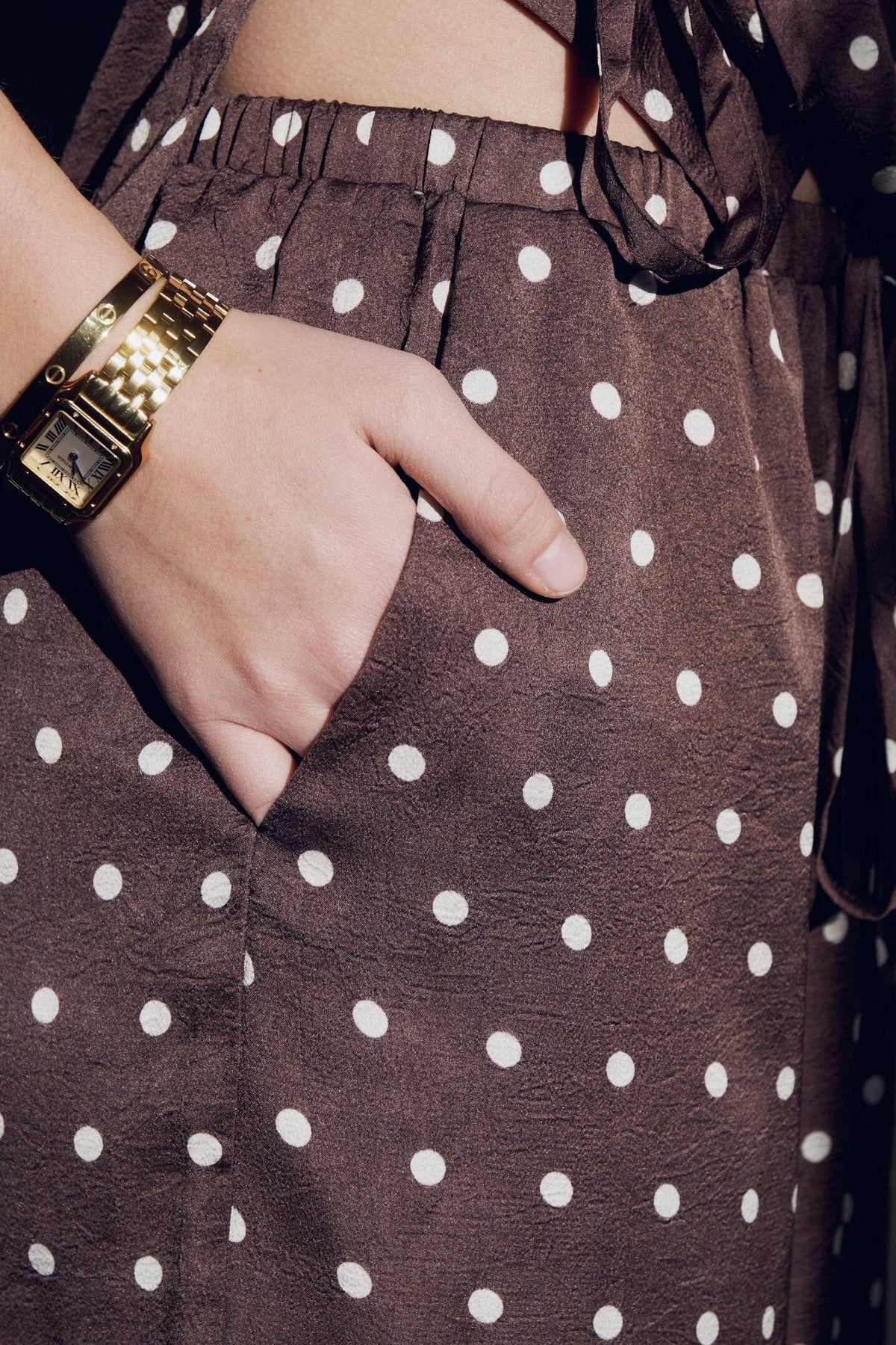 Tummanruskeat Neo Noir -housut, joissa on valkoisia pilkkuja. Valmistettu 100 % polyesteristä, rennolla istuvuudella ja lattiaan ulottuvalla pituudella.