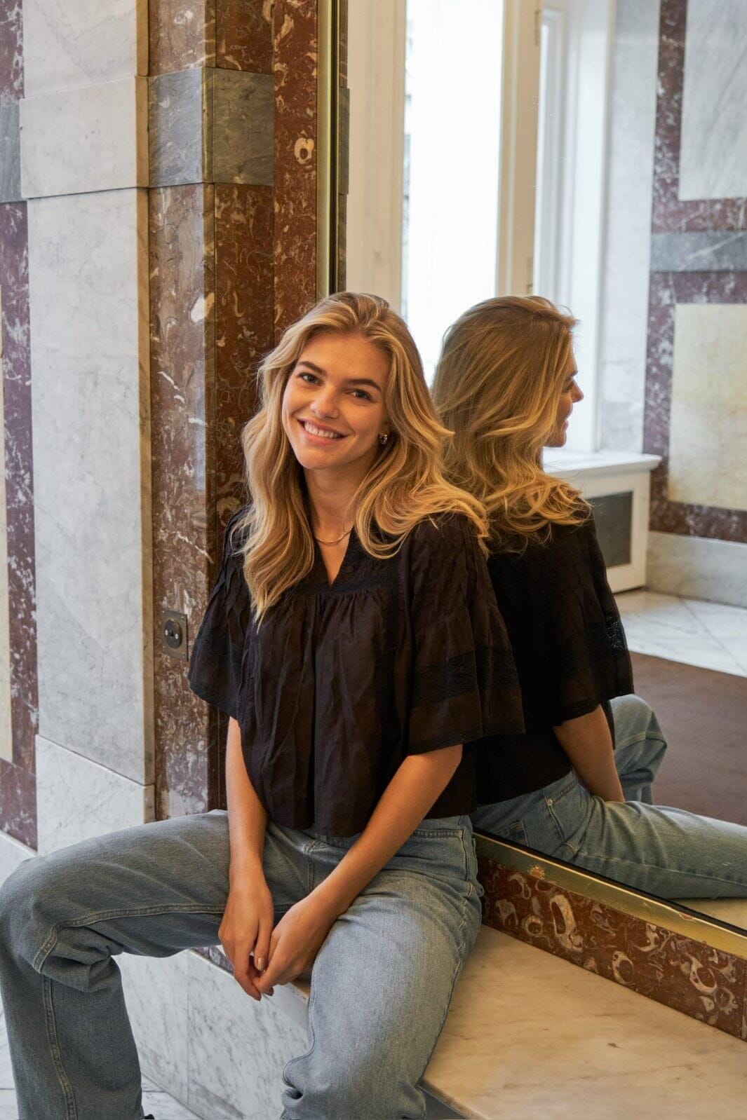 Musta voile-paita Neo Noirilta, jossa on löysä malli. Paidassa on nauhakiinnitykset ja pieniä laskoksia kaula-aukossa sekä leveät 3/4-hihat, jotka loppuvat juuri kyynärpään ylle.