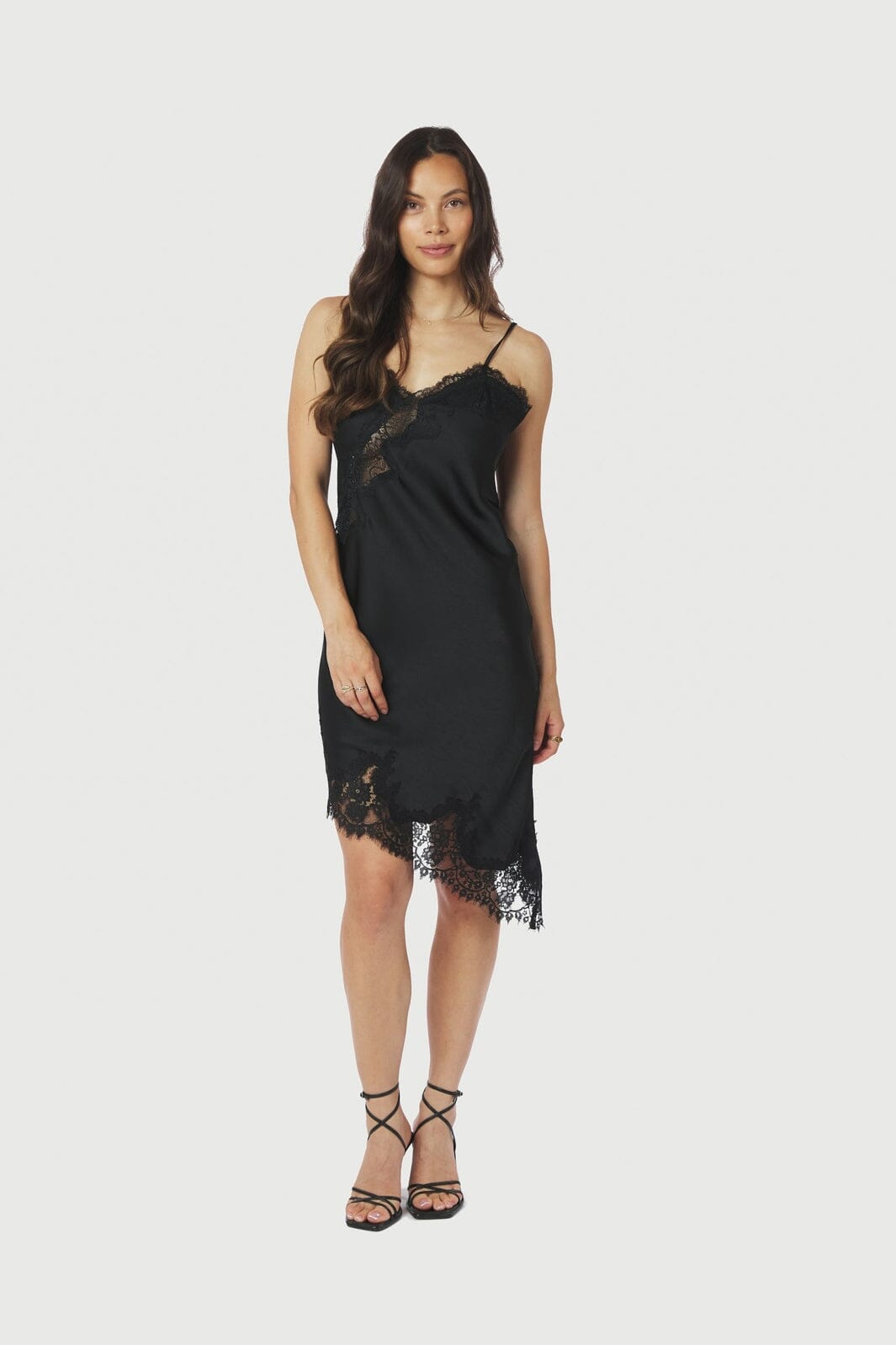 Musta pitsimekko Neo Noirilta epäsymmetrisellä helmalla. Mekossa on ohuet olkaimet ja pitsiyksityiskohtia V-pääntiellä sekä alareunassa.