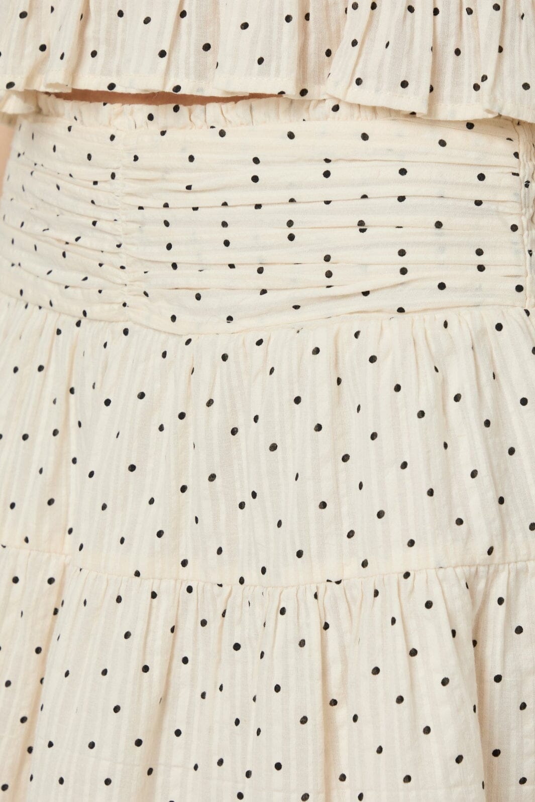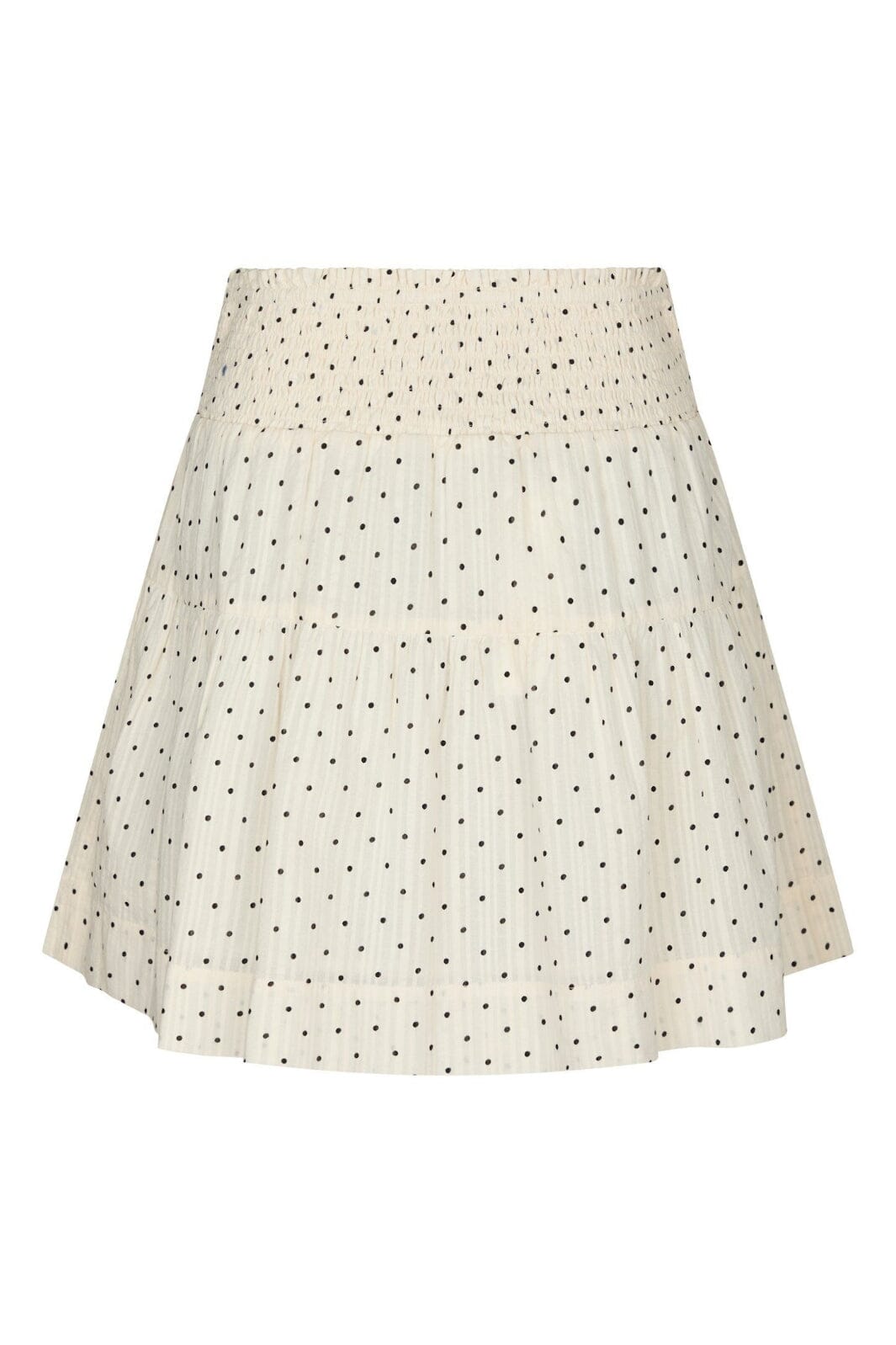 Kreeminvärinen hame Neo Noirilta mustilla pisteillä. Siinä on kerroksellinen muotoilu ja smock-yksityiskohta vyötäröllä. Puuvillakangas antaa kevyen ja ilmavan tunteen.