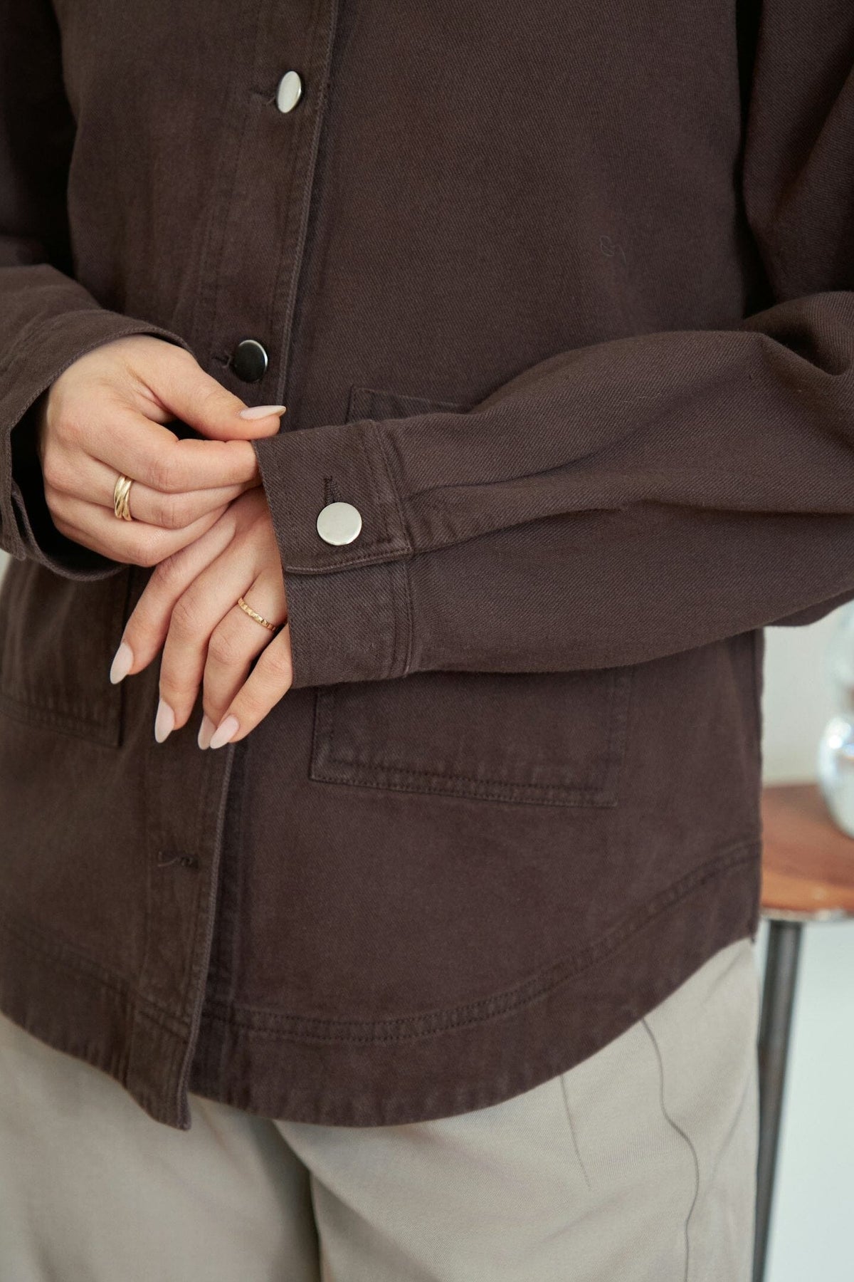 Tumma ruskea takki Neo Noirilta kanvasta. Takissa on rento malli, jossa on napit edessä ja kaksi rintataskua läpällä. Koristeelliset saumat antavat takille rustiikkisen ilmeen.