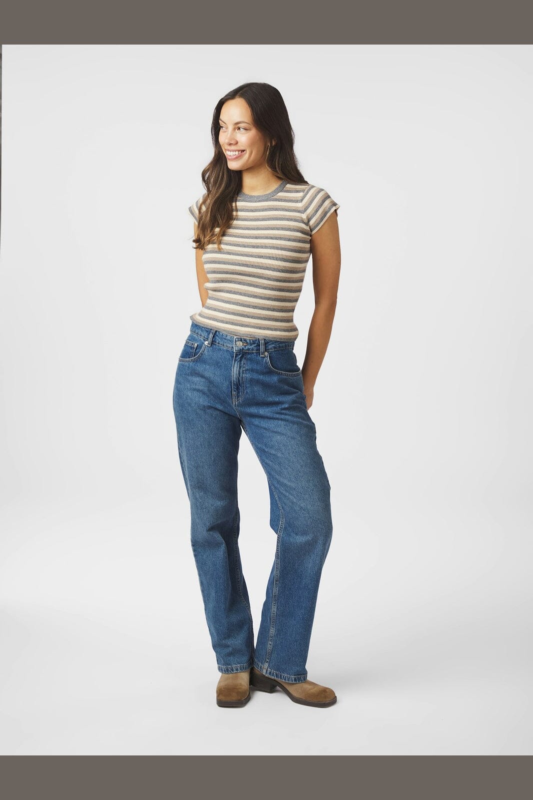 Raidallinen neulepaita Neo Noirilta harmaan ja beigen sävyissä. Paidassa on lyhyet hihat, vartaloa myötäilevä istuvuus ja pyöreä pääntie.