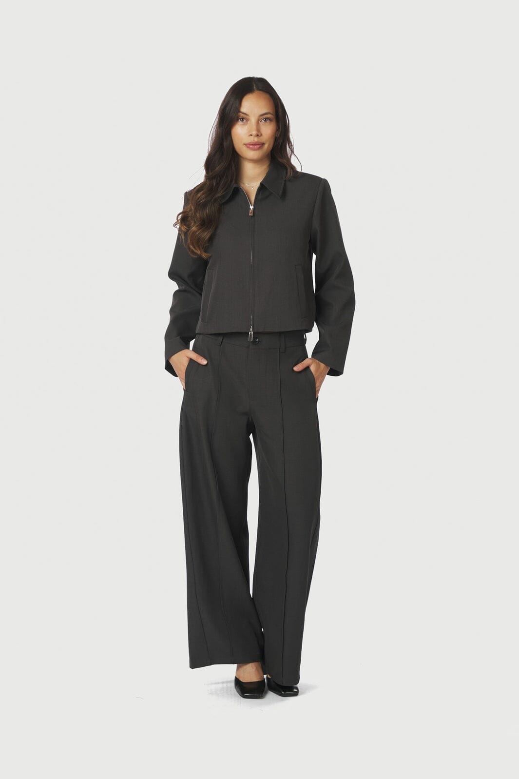 Tummanharmaa takki Neo Noirilta, jossa on klassinen kaulus ja vetoketjusuljenta. Takki on valmistettu hienosta puvuntakista, joka antaa siistin ja yksinkertaisen ilmeen.