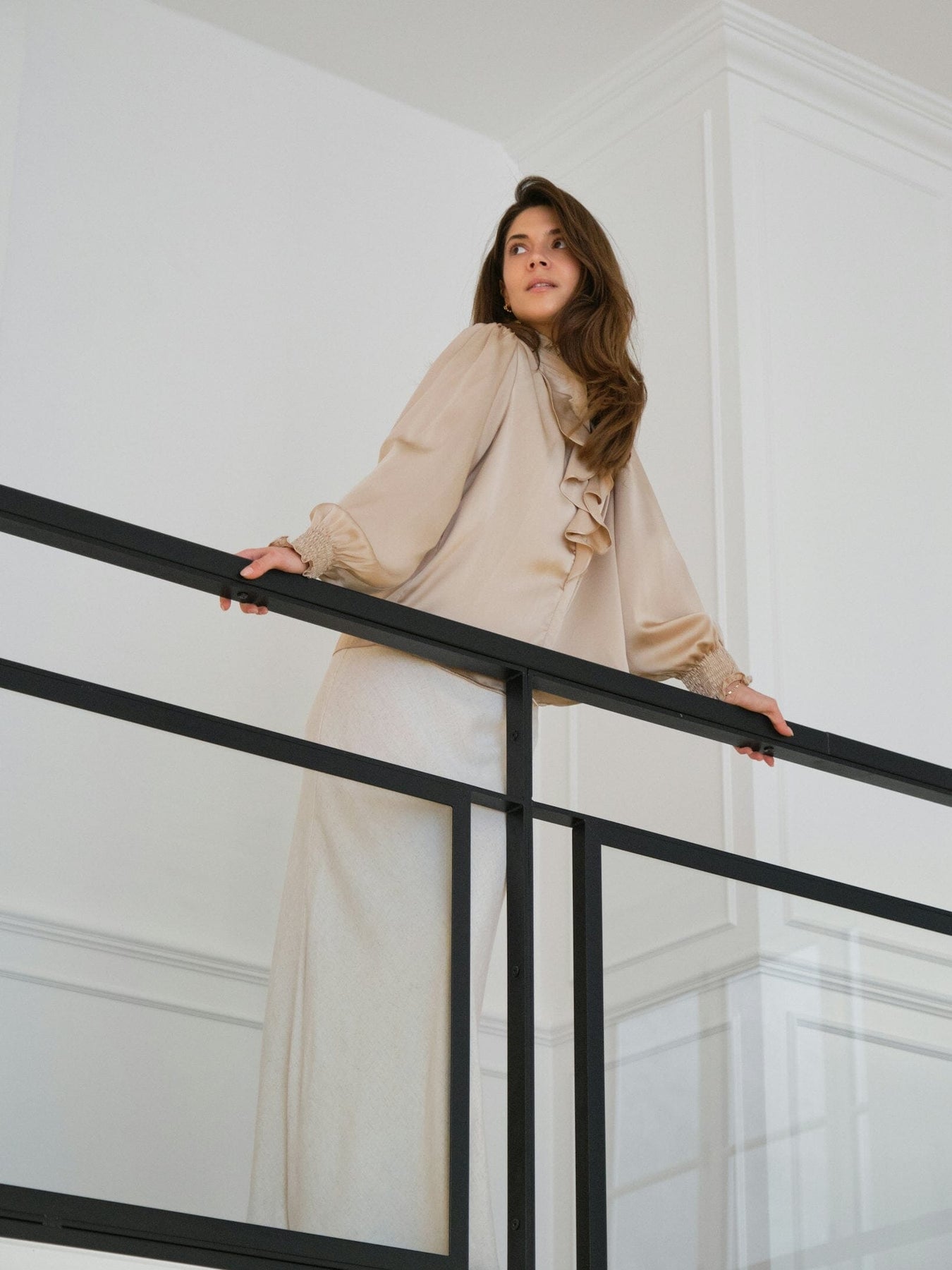 Neo Noir -merkin pusero vaaleassa hiekan sävyssä, valmistettu 100 % polyesteristä. Puserossa on röyhelöitä edessä ja smock-yksityiskohtia hihansuiden kohdalla.