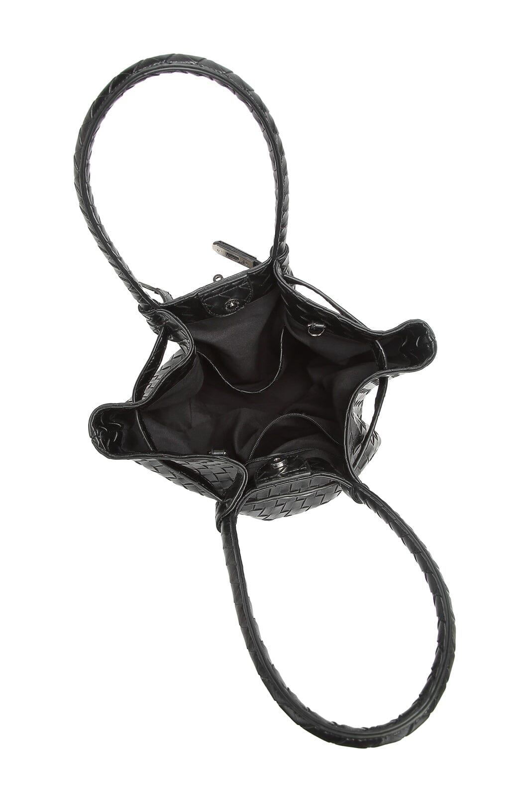 Musta Noella-laukku, valmistettu 100 % polyuretaanista ja kauttaaltaan punotulla pinnalla. Laukussa on kaksi pitkää kantohihnaa ja harjatun hopean väriset yksityiskohdat.