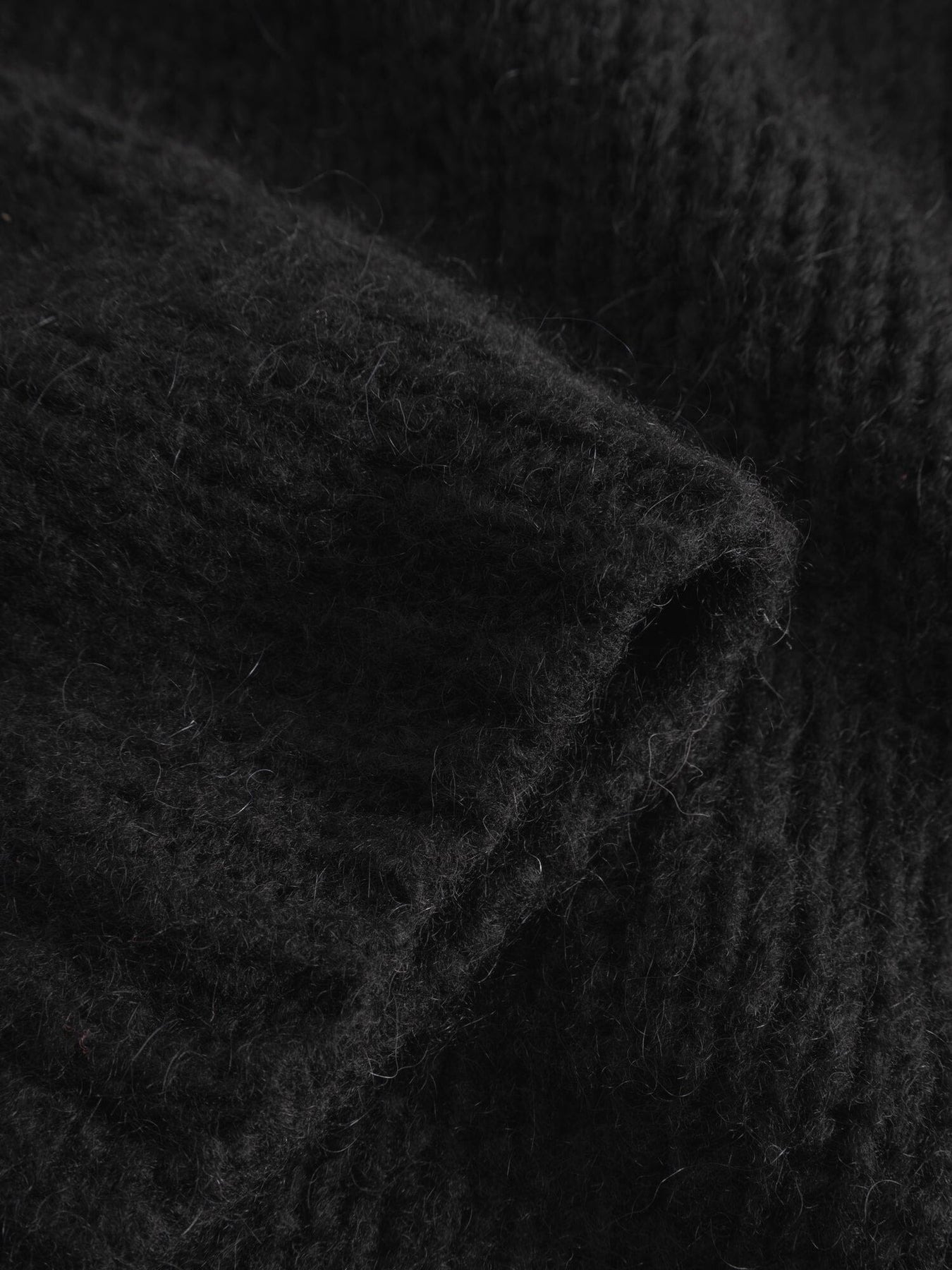Musta cardigan Noellalta, jossa on paksu neulottu tekstuuri. Avoin malli on löysästi istuva ja siinä on pitkät hihat, jotka tarjoavat hyvää liikkuvuutta.